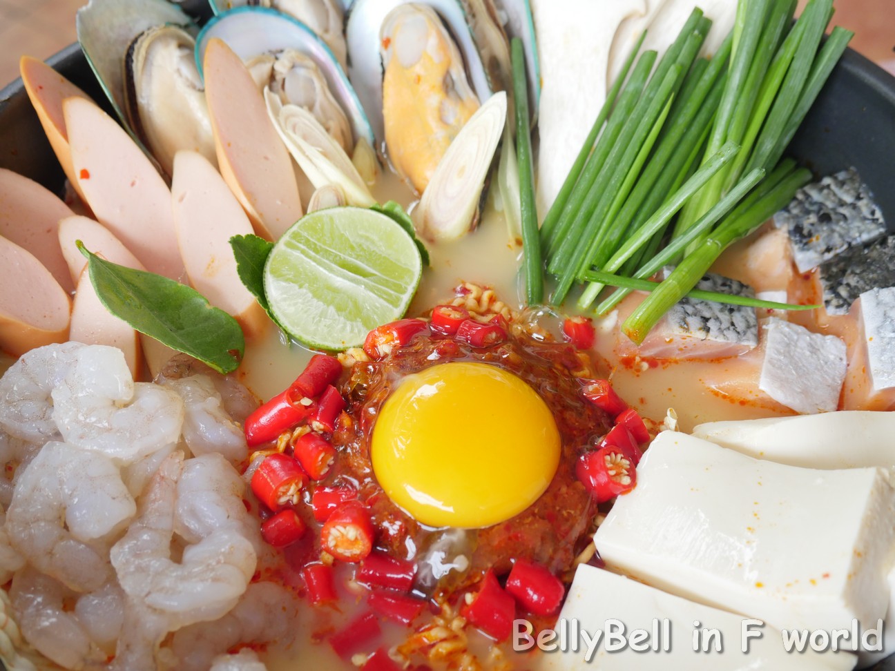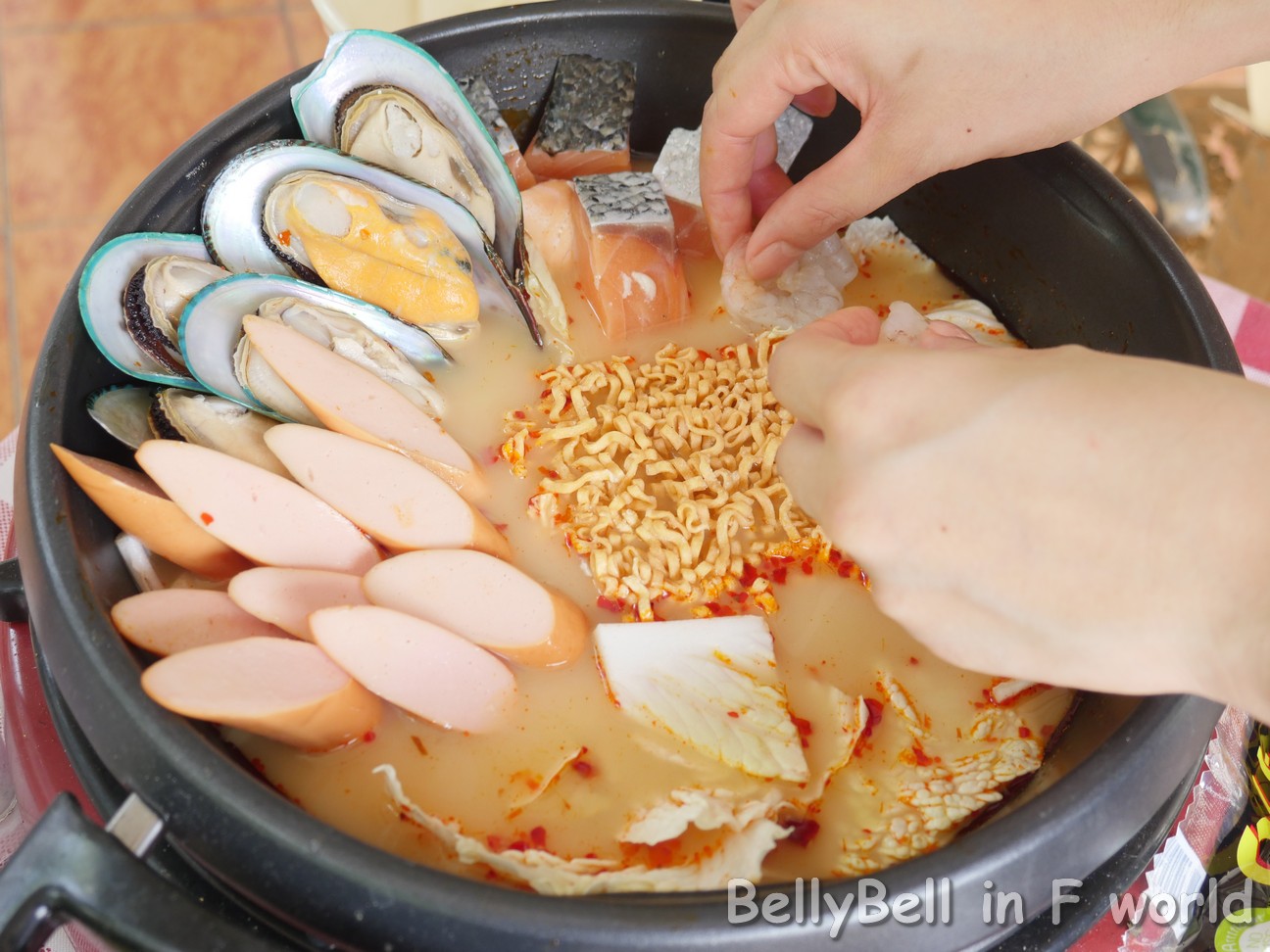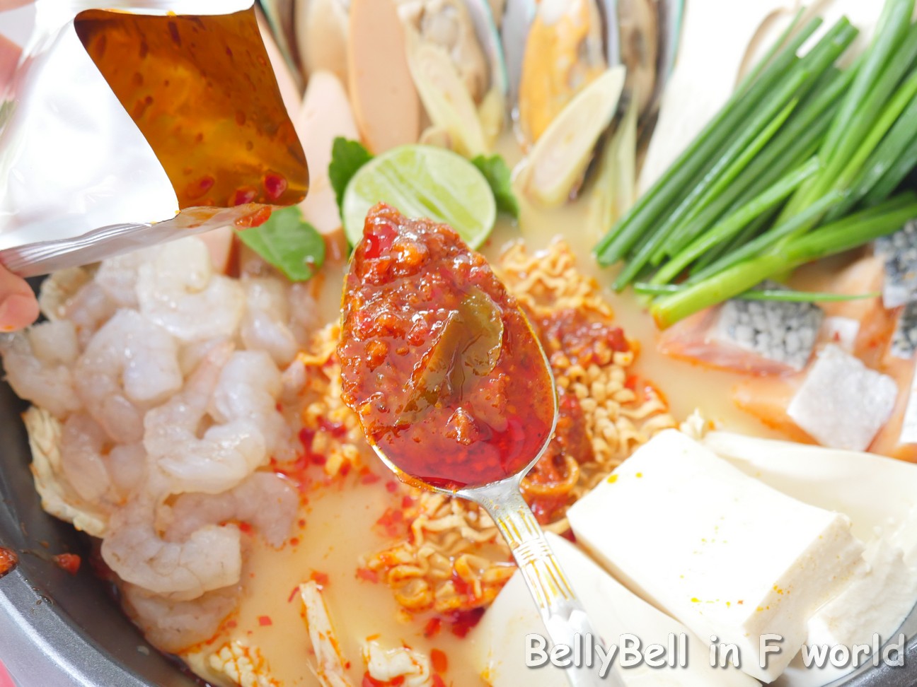 - โปรตีนของสด วันนี้เบลล์ทำเป็นตีมอาหารทะเล ก็เลยมี หอยแมลภู่, แซลมอน, กุ้งขาว, เต้าหู้ขาว, ไส้กรอก