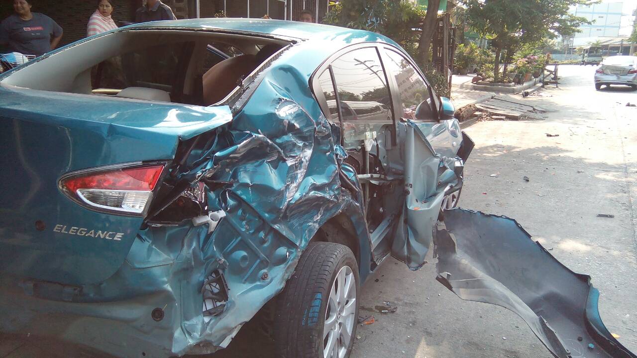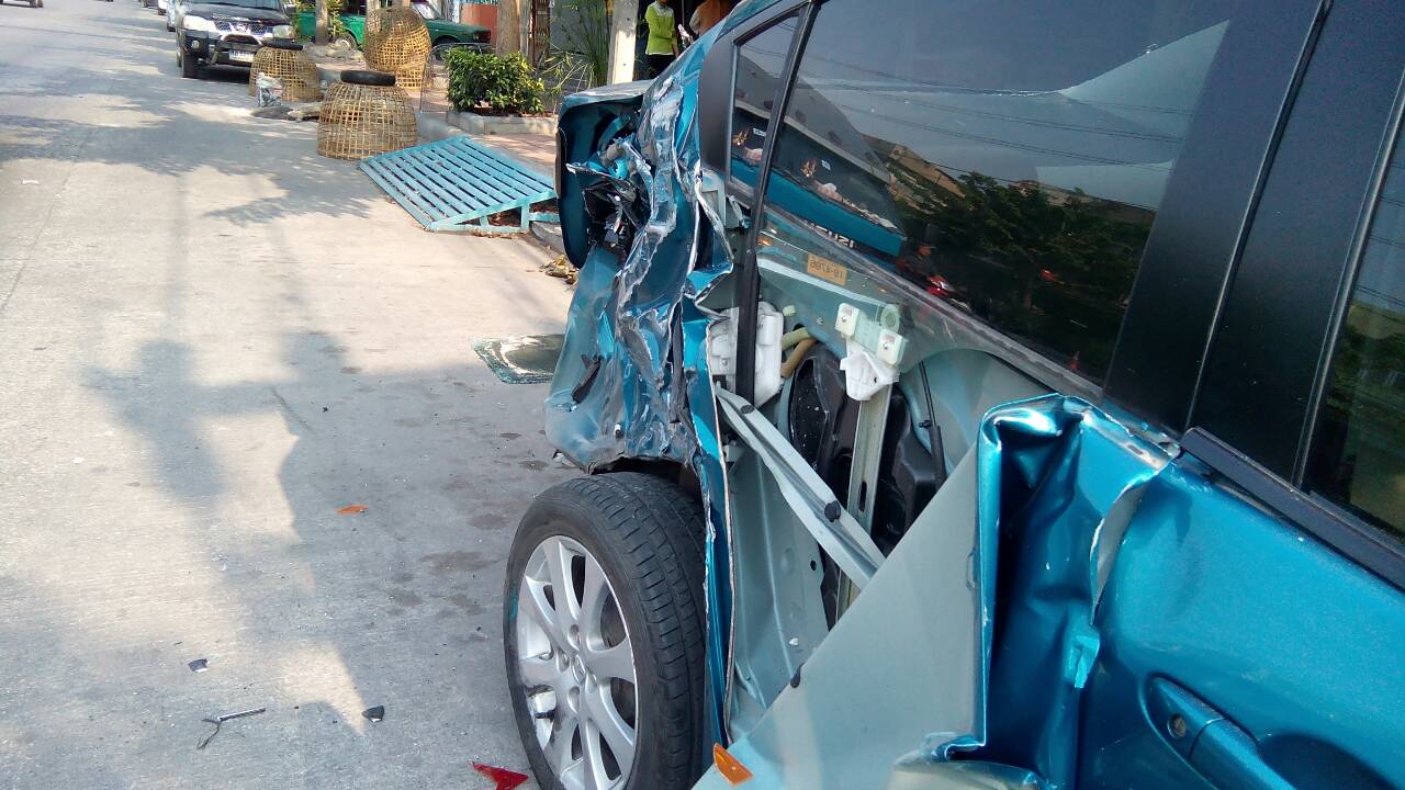 พึ่งจอดรถ อยู่ไม่ถึงครึ่ง ชั่วโมง ไปทำธุรระ สักพัก มีคนมาเรียกว่า รถถูก 6 ล้อมาชน ก็มาเร็วพอสมควรคนขับอ้างว่าพวงมาลัย หลุด