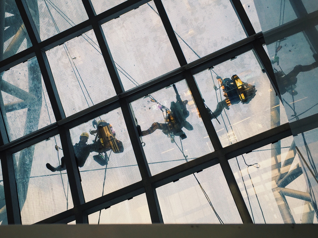 - ภาพคนงานกำลังเช็ด ทำความสะอาดกระจาก จากสนามบิน ครับ