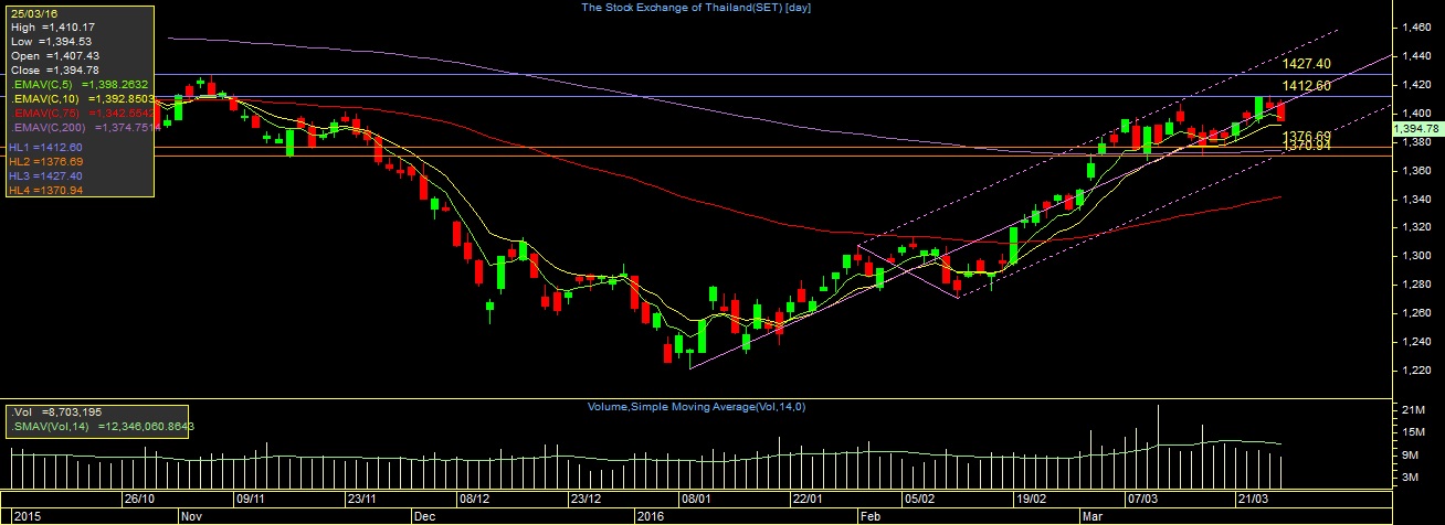 อาทิตย์นี้ขยับกรอบขึ้นมาอีกนิด เป็น1,412 - 1,376 มารอลุ้นกันต่อนะครับ อย่างน้อยขอให้EMA10=1,392เอาอยู่ก่อนเป็นด่านแรก ^^