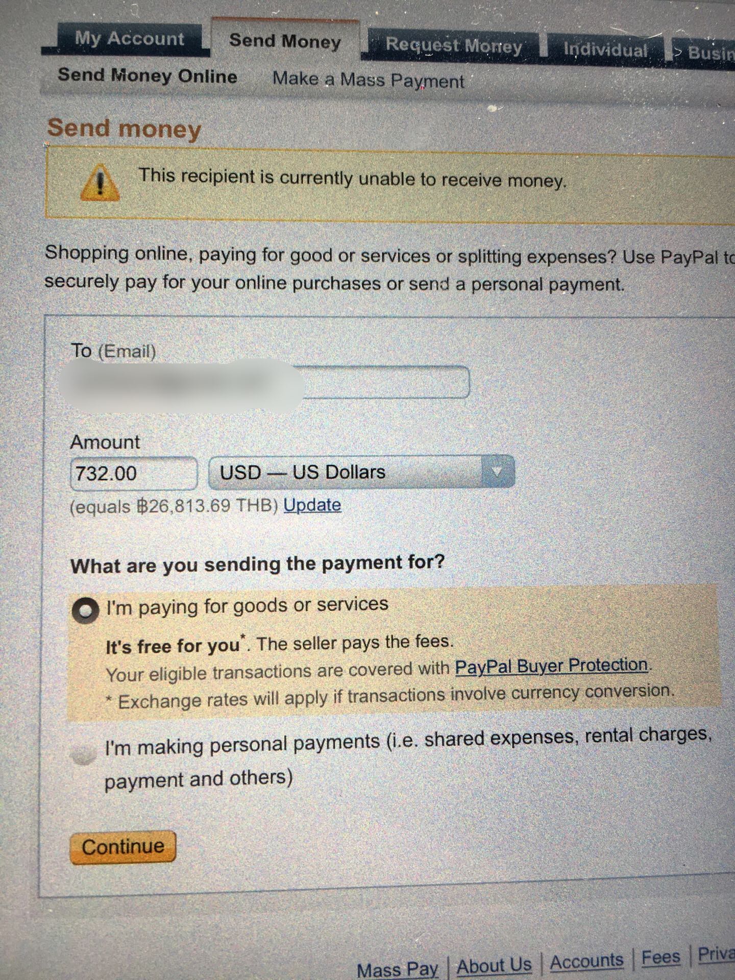 จะโอนเงินผ่าน paypal แต่ขึ้น This recipient is currently unable to receive money ต้องทำไงครับ
