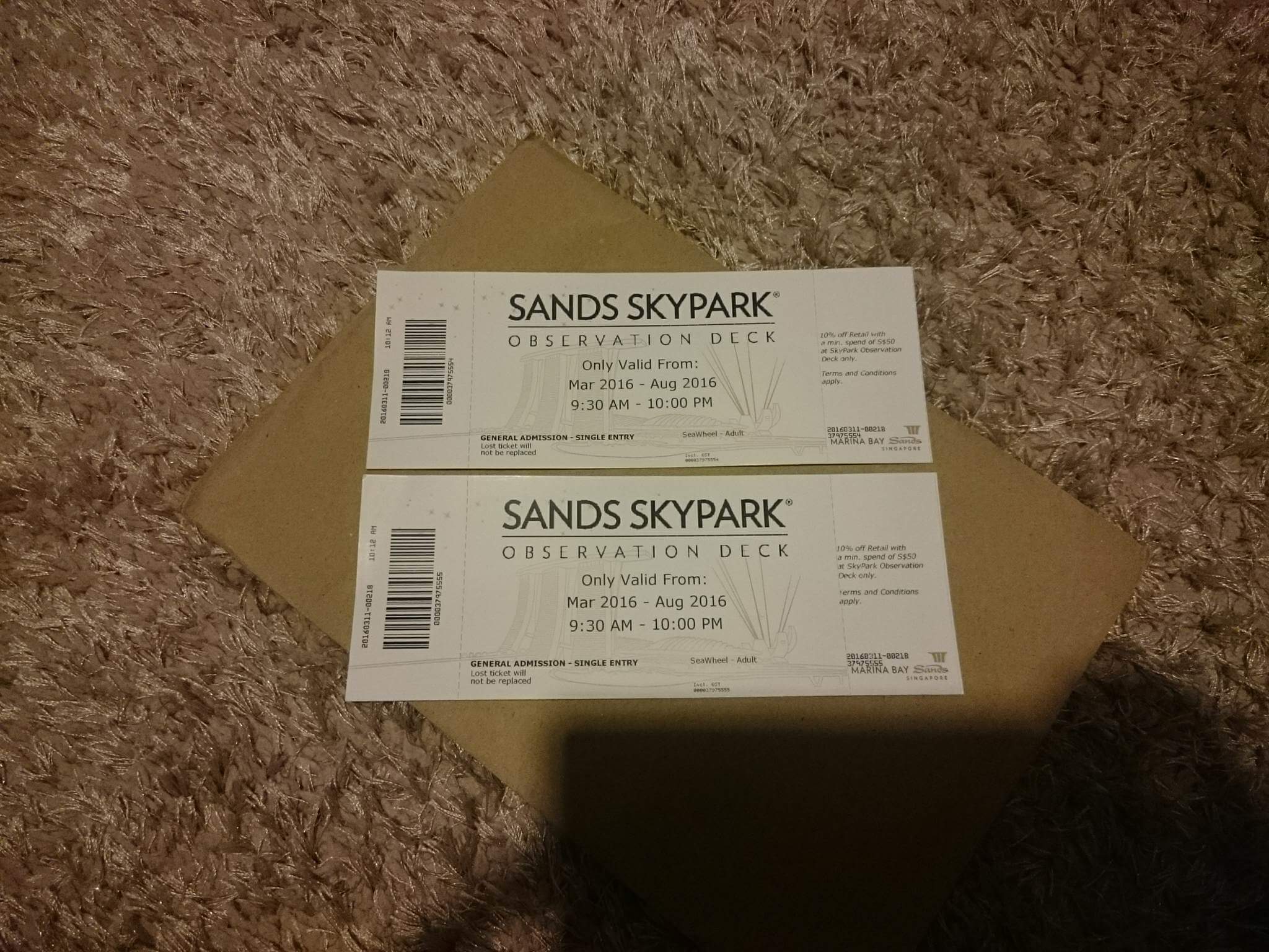 ผมซื้อบัตร Sands Sky Park มาจาก Sea Wheel Travel มา 2 ใบ มูลค่า 38 SGD และเนื่องด้วยผมขึ้นไปมาแล้ว ไม่มีพนักงานมาฉีกหางบัตร จึงยังไม่ได้ใช้บัตร