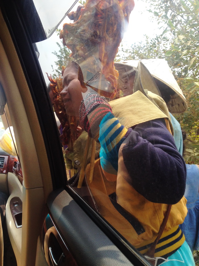 ......มาได้สักพักพี่แหล่จอดรถ บอกจะแวะทานข้าว...ทันใดนั้นกองทัพไก่ ตับ ไต ไส้ พุง ย่างมาล้อมหน้าล้อมหลังรถพวกเรา...เพื่อนในรถถึงกับบอกว่า เห้ย!!!กูกลัว กูไม่กล้าลงรถ ก็จะอะไรหล่ะค่ะพี่แกเล่นเคาะกระจกในมือถืออาวุธพร้อม เฮ้ยยยย...ถือไก่ย่าง เพื่อจะให้เราช่วยซื้อ...ใจจริงเราอยากทานนกมากกกก แต่จะซื้อคนนี้ก็ต้องซื้อคนโน้นด้วย....สรุป..ไม่ต้องซื้อสักคน