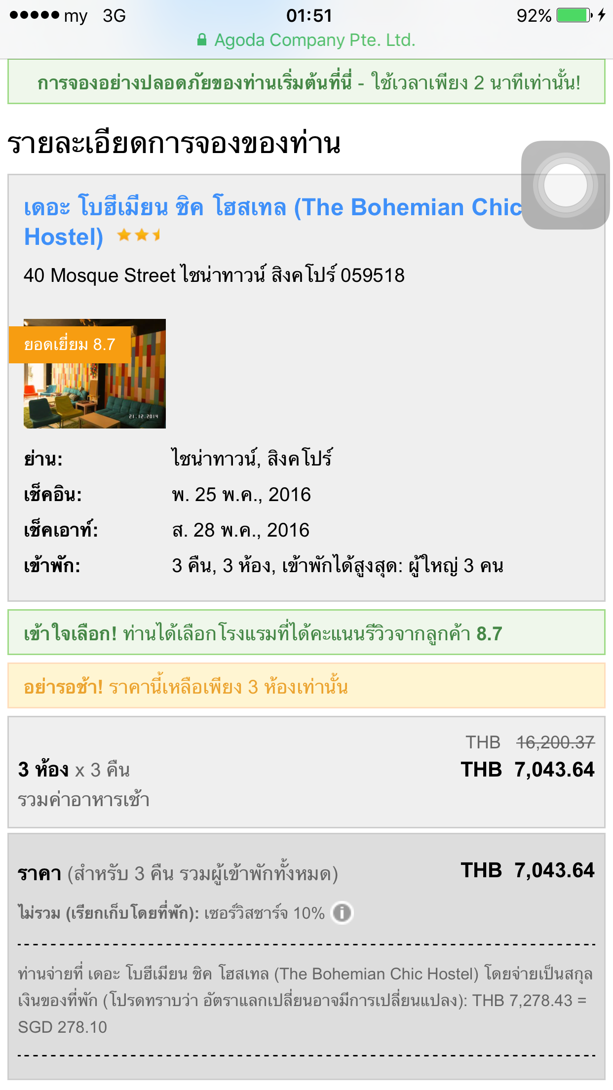 คือเราเห็นห้องพักมันถูกค่ะแล้วมันขึ้นว่า จองก่อนจ่ายทีหลัง. เราก็ทำการจองค่ะ พอถึงขั้นตอนสุดท้าย มันให้ใส่บัตรเครดิตค่ะ คือเราไม่มีอะคะ. คือจองจะไปสิงค์โปรค่ะ