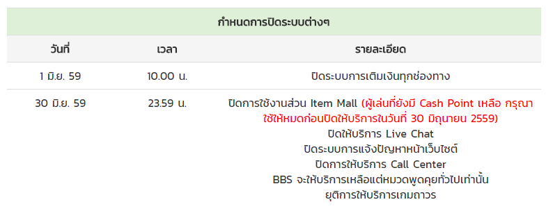 ตามประกาศบนเว็บไซต์ระบุว่า บริษัทเอเชียซอฟท์ คอร์ปอเรชั่น จำกัด (มหาชน) ผู้ให้บริการเกม Ragnarok Online ในประเทศไทย ขอแจ้งให้ผู้เล่นทุกท่านได้ทราบว่า การให้บริการ เกม Ragnarok Online ภายใต้การดูแลของ บริษัทเอเชียซอฟท์ คอร์ปอเรชั่น จำกัด (มหาชน) จะสิ้นสุดลง ในวันที่ 30 มิถุนายน 2559 ตามรายละเอียดดังนี้