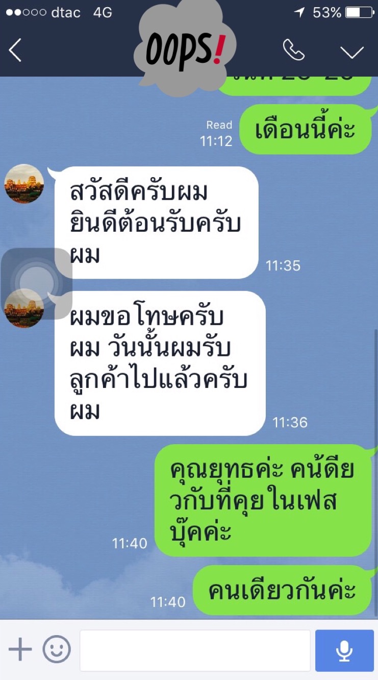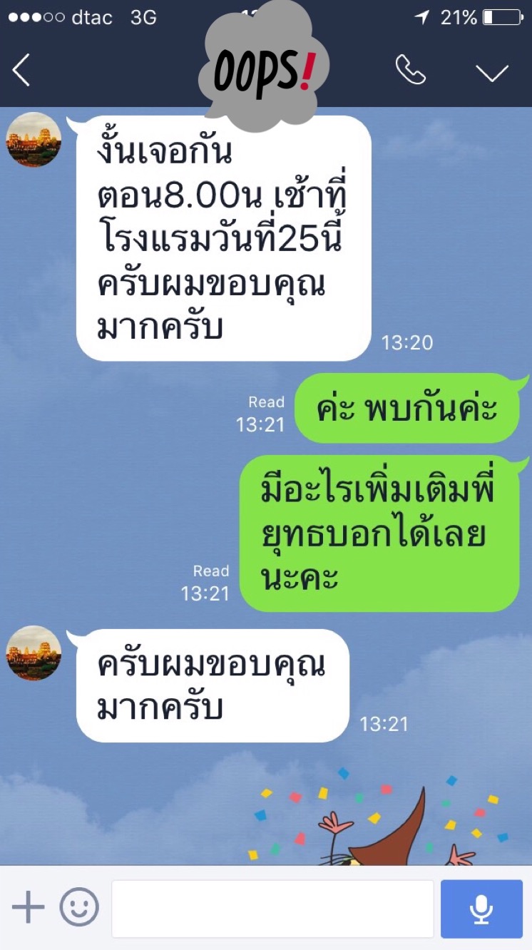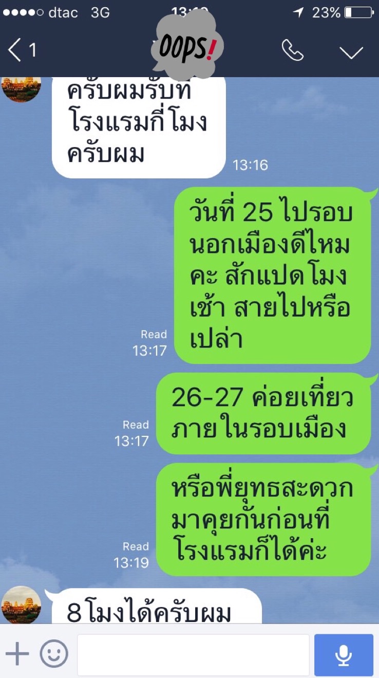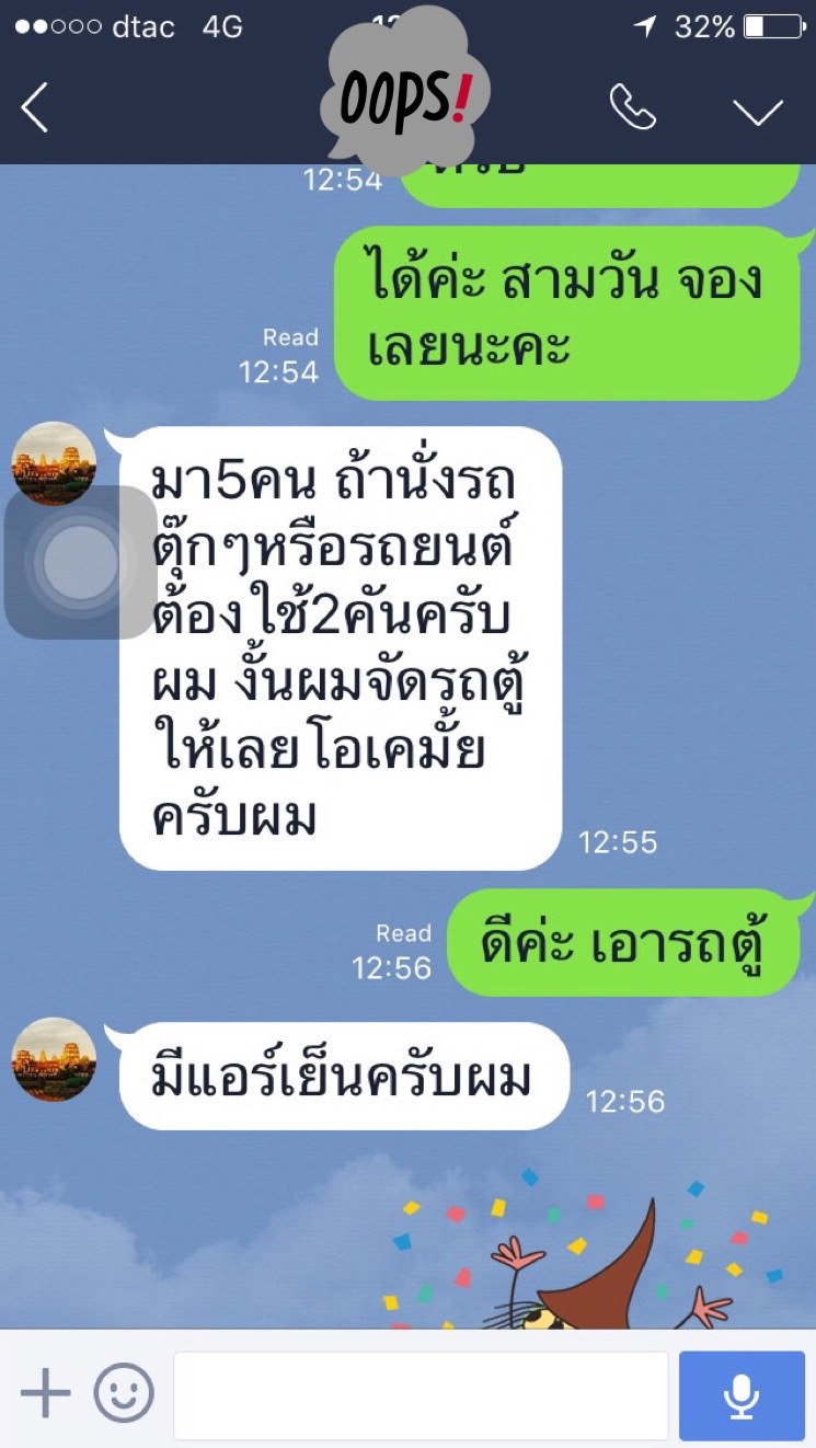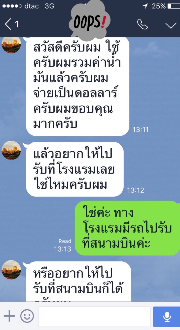 พวกเราเห็นว่าภาษาไทยของแกชัดเจนมาก พิมพ์ถูกต้องทุกคำ โดยที่เราเป็นคนไทยแท้ๆยังรู้สึกแย่เลยที่พิมพ์ไม่ถูก เราเลยวางใจกันเรื่องคนขับรถว่าไว้ใจได้และไปเตรียมเรื่องอื่นต่อ