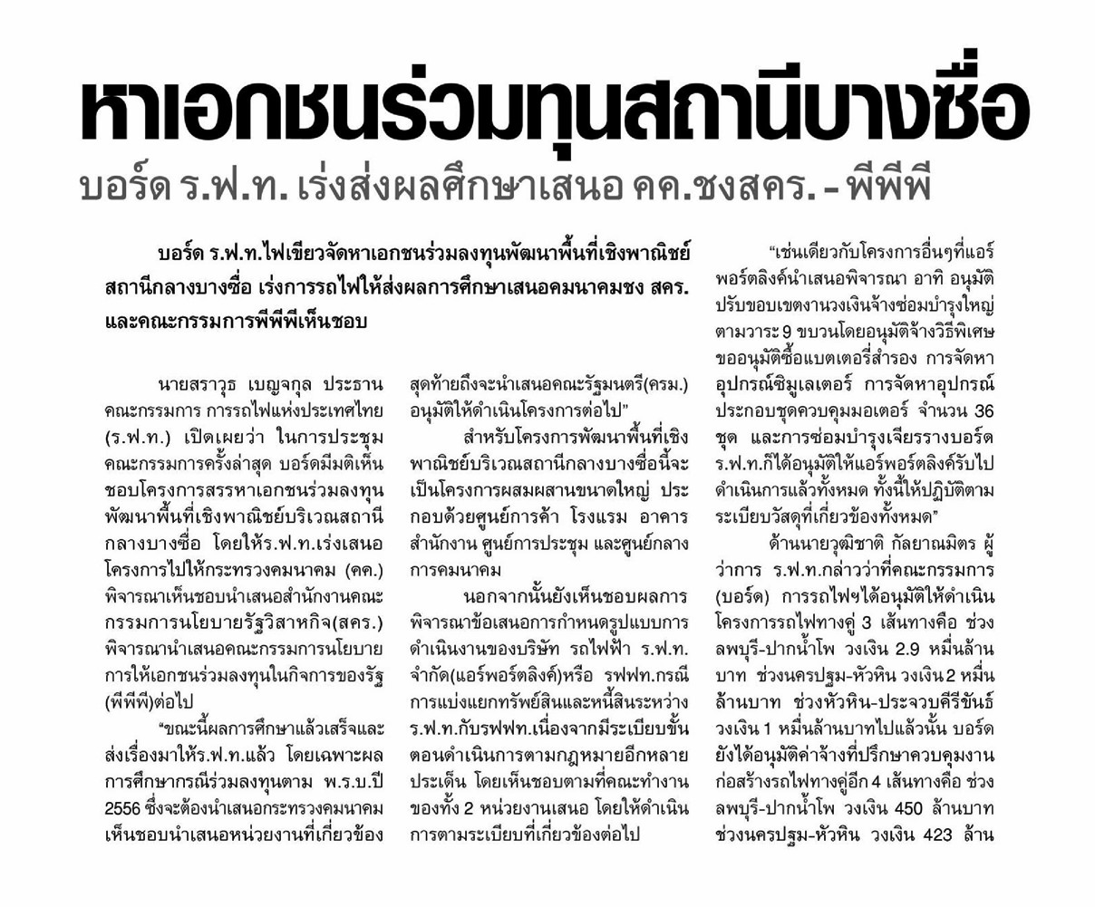 รถไฟฯฮึด ลุยล้างหนี้เอง! ชงพื้นที่บางซื่อ เข้ากองทุนฯ/แปลงอื่นเอกชนร่วม ฐานเศรษฐกิจ ฉบับวันที่ 14 ธันวาคม พ.ศ. 2557 15/12/57 ประชาชาติธุรกิจ คอลัมน์ ข่าวสั้น: รัฐบาลไทย-จีน MOU สร้างทางรถไฟ