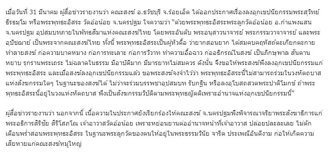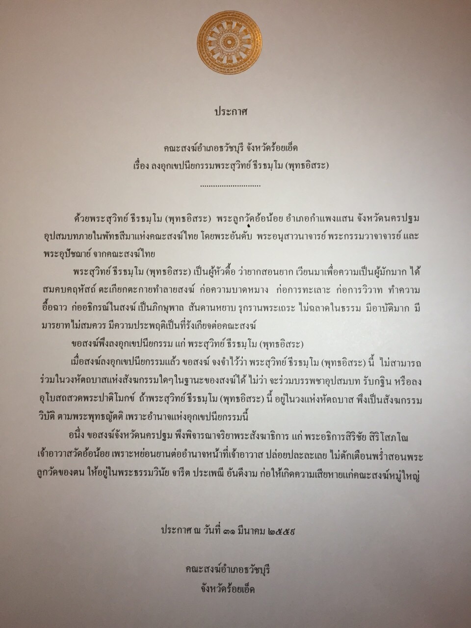 เมื่อวันที่ 1 เมษายน ผู้สื่อข่าวรายงานว่า คณะสงฆ์จังหวัดขอนแก่น ออกประกาศเรื่อง ขอให้สงฆ์ลงอุกเขปนียกรรม แก่ ภิกษุผู้ตะเกียกตะกายทำลายสงฆ์ ใจความว่า “คณะสงฆ์จังหวัดขอนแก่น มีฉันทานุมัติให้พระสัง
