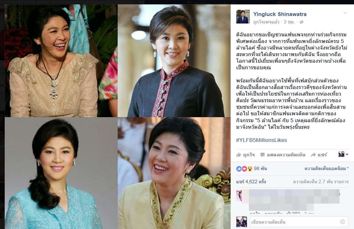 เมื่อวันที่ 4 เมษายน น.ส.ยิ่งลักษณ์ ชินวัตร อดีตนายกฯ โพสต์ข้อความผ่านเฟซบุ๊กส่วนตัว ว่า อยากขอเชิญชวนแฟนเพจทุกคนร่วมกิจกรรมพิเศษต่อเนื่อง จากการที่แฟนเพจยิ่งลักษณ์ครบ 5 ล้านไลค์ ซึ่งอาจมีหลายคนที่อยู่ในต่างจังหวัดยังไม่สะดวกที่จะได้เดินทางมาพบกับตนจึงอยากถือโอกาสนี้ไปเยี่ยมเพื่อนๆ ถึงจังหวัดของท่านบ้างเพื่อเป็นการขอบคุณ พร้อมกันนี้ตนอยากใช้พื้นที่เฟสบุ๊กส่วนตัวของตนเป็นสื่อกลางสื่อสารเรื่องราวดีๆของจังหวัดท่าน เพื่อให้เป็นประโยชน์ในการส่งเสริมการท่องเที่ยว ศิลปะ วัฒนธรรมอาหารพื้นบ้าน และเรื่องราวของชุมชนที่ควรค่าแก่การจดจำและบอกต่อเพื่อสืบสานต่อไป ขอให้สมาชิกแฟนเพจติดตามกติกาของกิจกรรม 5 ล้านไลค์ กับ 5 เหตุผลที่ยิ่งลักษณ์ต้องมาจังหวัดฉันได้ในวันพรุ่งนี้