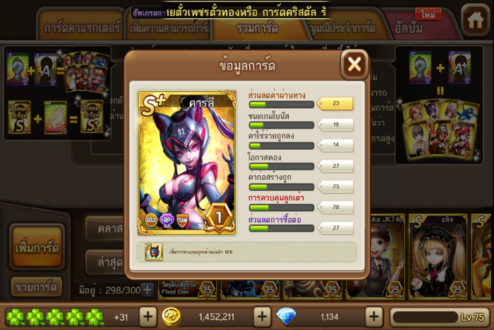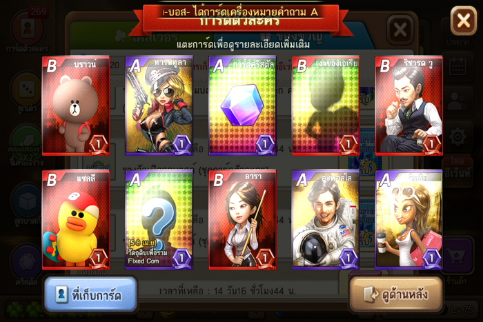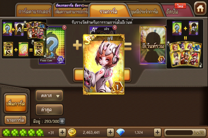 ทีแรกคิดไว้ในใจว่าคงจะได้ใบเดียวนี่แหละ ก็ไปสุ่มเพื่อหาปีกหรือการ์ดคำถาม สุ่มได้การ์ดคำถามมา5ใบ รวมกับชนะไลน์วิคอีก1ใบเป็น6ใบ คิดอยู่ว่าจะเอาไงดี จะเสี่ยงแลกA+ดีมั้ย แต่เอ๊ะมันขาดอีก4ใบเอง สุ่มหาต่อเถอะเพื่อจะเอา10ใบมาแลกปีกได้ชัวร์ๆดีกว่า ปรากฏว่าสุ่มได้การ์ดคำถามA+ โอ้วเย้ จัดแจงอัพรวมทันที ได้การ์ดลูซี่มา เย้ๆไม่ซ้ำเฟ้ย