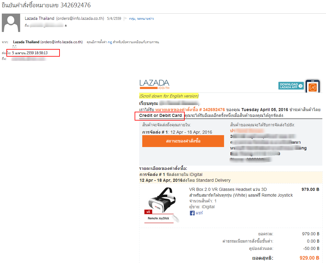 เนื่องจากเกิดเหตุเมื่อวาน ผมสั่งซื้อสินค้า โดย Login ผ่าน Facebook ซึ่งเคยมีธุรกรรมกับ Lazada มาก่อน แต่ก็เกิดเรื่องเมื่อผมไม่ได้ใช้งานมานาน ผมได้กดสั่งซื้อไป และได้ชำระผ่านบัตร K-Web Shopping Card ของกสิกรไทย โดยการตัดเงินสด