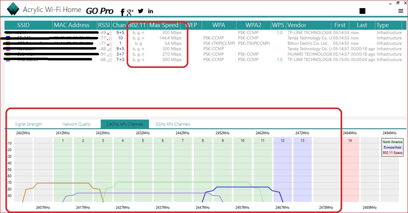 ลองดูรูปแรก ตรงกราฟเยอะๆเอามาเปรียบเทียบครับ นั่นคือความถี่ 2.5GHz ที่ Router รุ่นเก่าๆ (รวมถึงรุ่นใหม่ๆ) นิยมใช้กันอยู่ ถามว่าดีไหมดีครับ คือส่งได้ไกล แต่แรงสู้ ความถี่ 5 GHz ไม่ได้ และแน่นอนครับ คนใช้เยอะ ความถี่ก็ตีกันแน่นอน ลองดูรูปแรกครับ กราฟทับกันเยอะมาก
