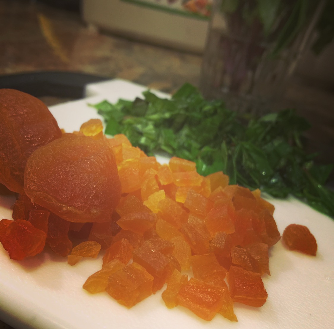 1. หั่นแอปริคอทแห้งเป็นเต๋าเล็กๆ และซอยใบโหระพารอท่า ปริมาณจะมากจะน้อยนี่แล้วแต่ความชอบของแต่ละคนเลยคะ