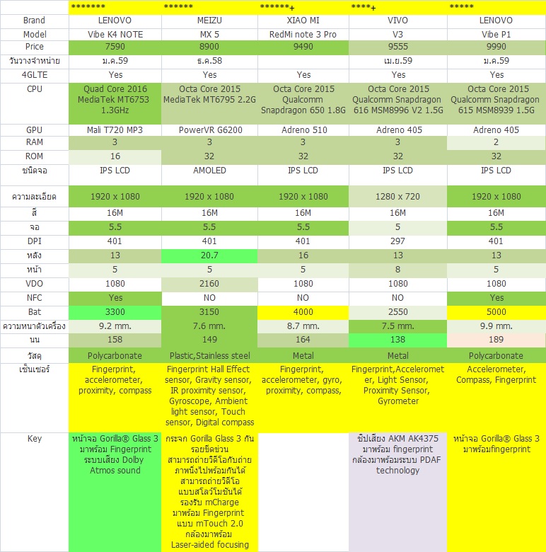 Lenovo K4note v Meizu MX5 v XiaoMi Redmi note3 pro v Vivo V3 v Lenovo vibe P1 อันไหนดีครับ?