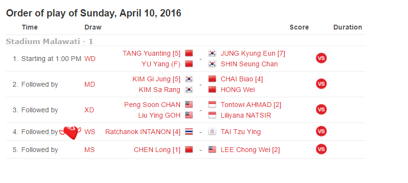 Order of play วันอาทิตย์ ที่ 10 แบดมินตัน CELCOM AXIATA Malaysia Open 2016