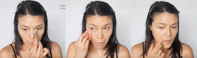 3. ทา concealer ทับ corrector แล้วเกลี่ย ถ้ามีรอยสิวหรือสีผิวไม่สม่ำเสมอก็กลบด้วย concealer ค่ะ