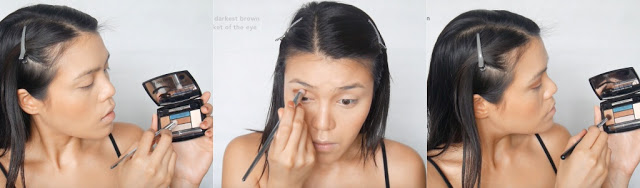 7. ทาอายแชโดว์สรน้ำตาลเข้มที่รอบพับกระบอกตา แล้วแตะสีน้ำตาลอ่อนเกลี่ยตาม
