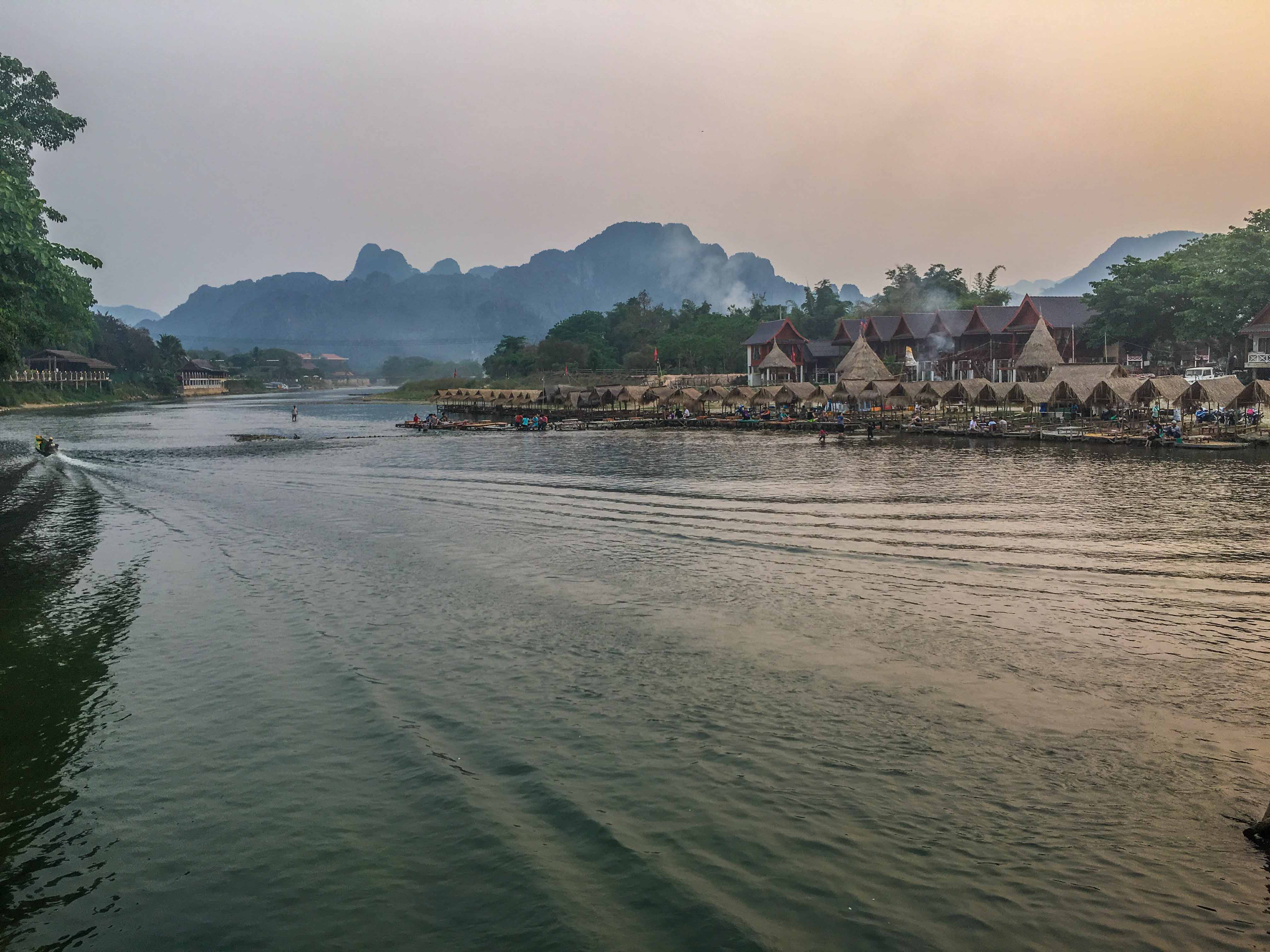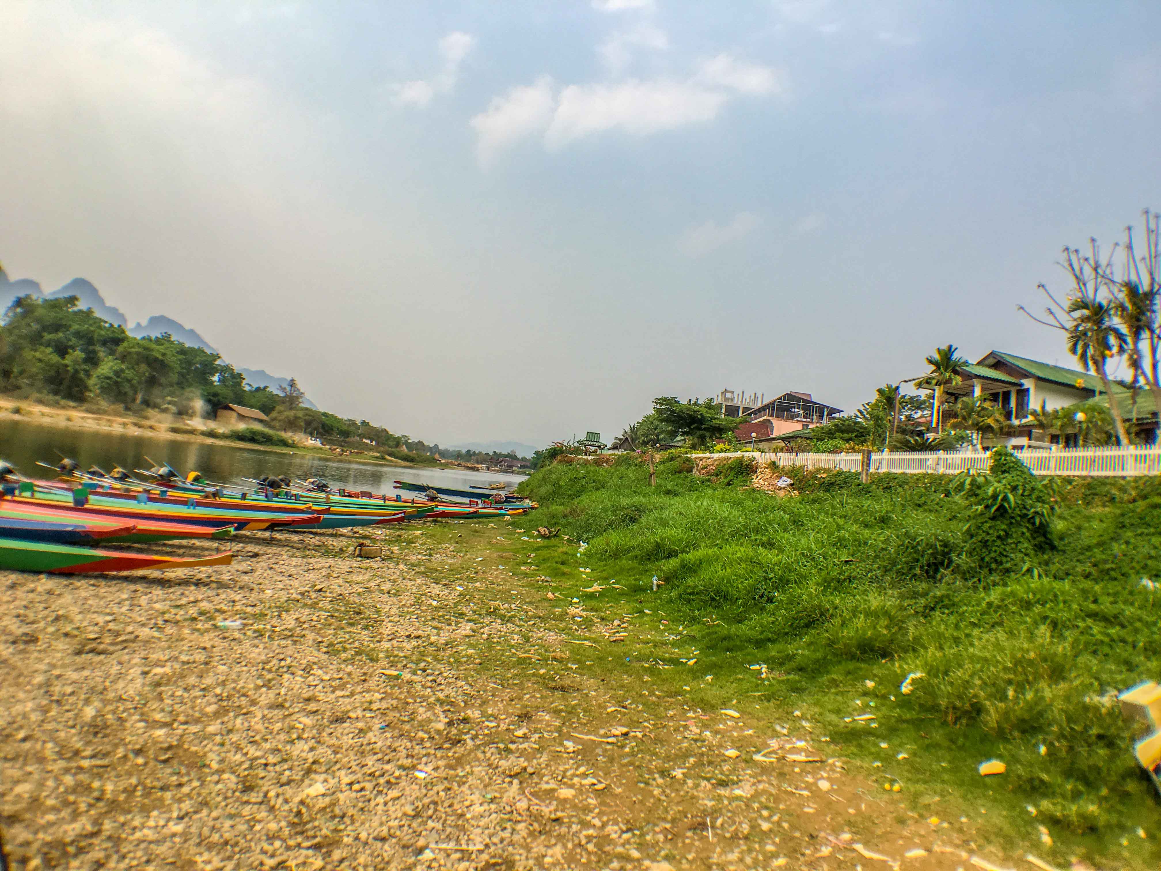 ระหว่างทาง รถก็แวะพัก 1ครั้งเพื่อทานข้าวเที่ยงกัน โดนไปเลยค่ะมาม่าหนึ่งกระป๋องราคา 10,000 กีบ มื้อแรก ณ ลาว เสียไปเป็นหมื่น ฮ่าๆ เรามาถึงวังเวียงกันตอนประมาณบ่ายสองโมง มีรถฟรีมารับจากท่ารถไปส่งที่คล้ายๆ กับ tourist information centre แล้วเราเดินต่อไปพักที่ Hostel ที่จองไว้ ยออมรับเลยค่ะว่าเหนื่อยมากๆ วันแรก เก็บของเสร็จออกมา ว่าจะชมเมืองสักหน่อย เพราะเย็นแล้วคงไปทำกิจกรรมอะไรไม่ได้ เลยเดินตามหาแม่น้ำซองกัน ที่ใช้คำว่าตามหาคือเราตามหากันจริงๆ จนมาเจอวิวที่ดีและสวยมากๆ ของวังเวียง