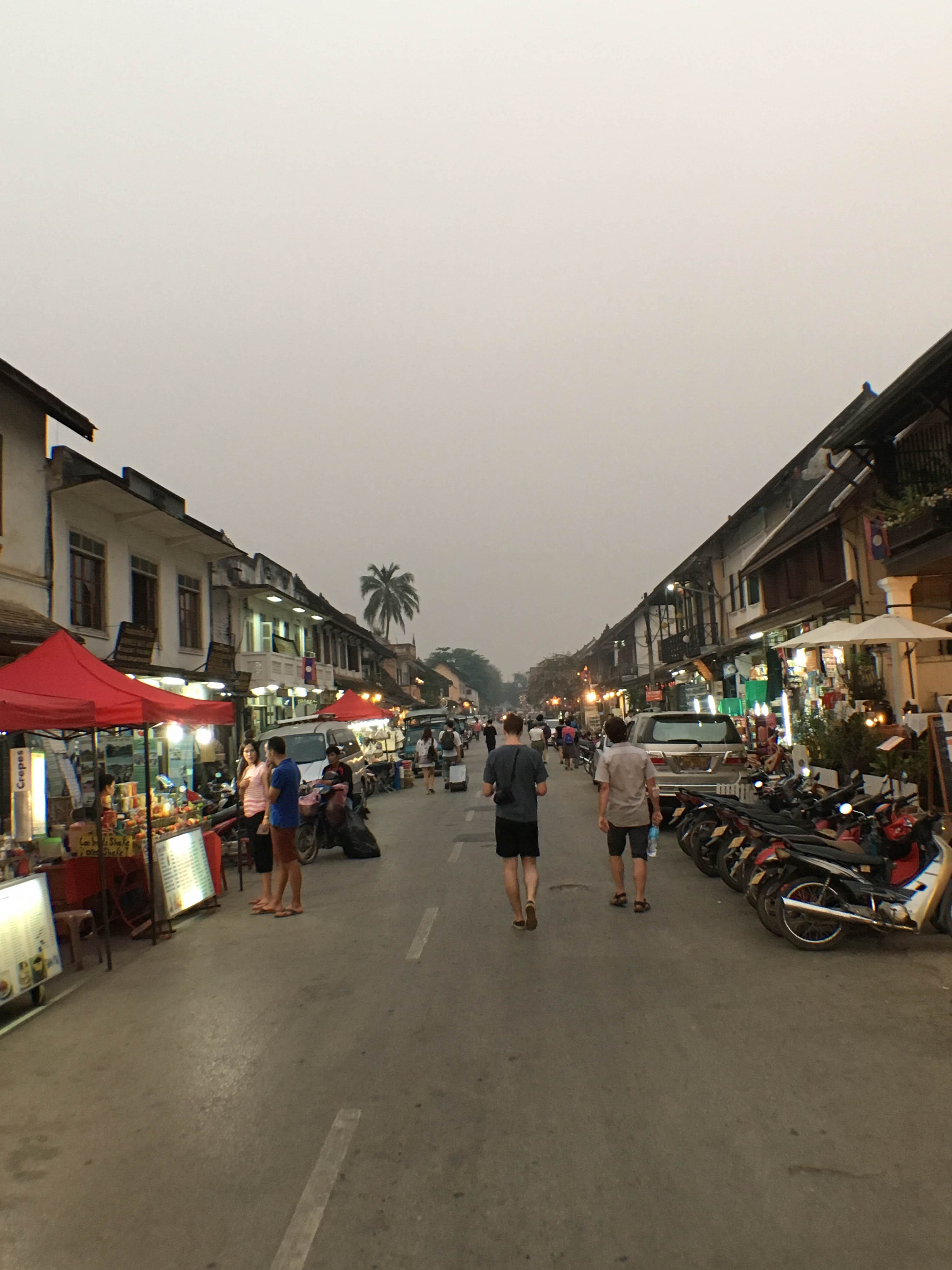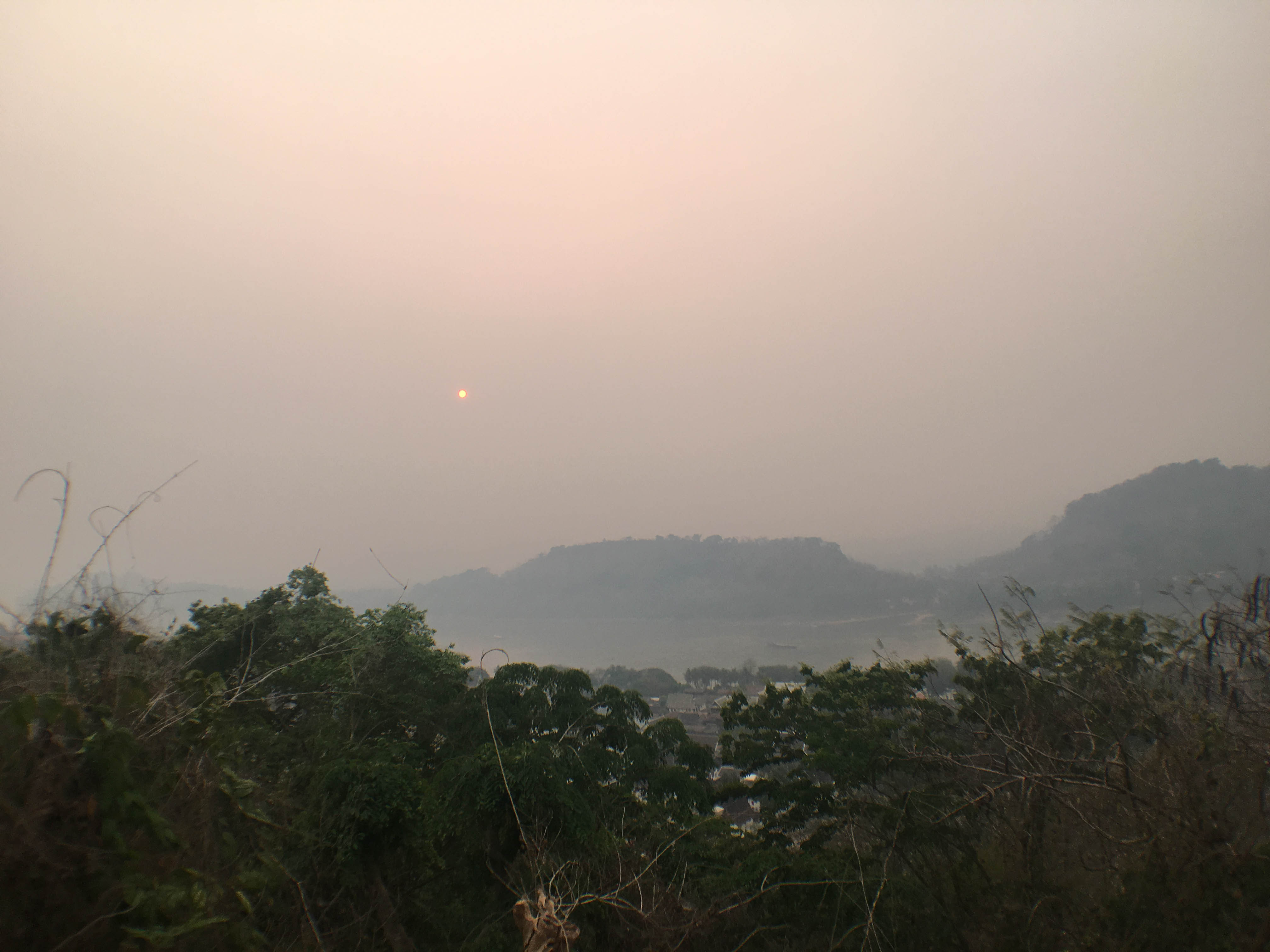 ในที่สุดเราก็มาถึงหลวงพระบาง บรรยากาศแตกต่างจากวังเวียงสิ้นเชิง อากาศมีแต่กลิ้นควันไหม้จากการเผาป่า แต่หลวงพระบางได้กลิ่นไอของความเจริญมาก หลังจากเก็บของในHostel เสร็จ เราก็แพลนว่าจะไปหาอะไรกินก่อนเพราะไม่ได้กินอะไรกันตั้งแต่เช้า แล้วหลังจากนั้นจะไปที่พระธาตุขึ้นไปรอดูพระอาทิตย์ตกดินตอนหกโมงครึ่ง หลังจากที่เดินหาร้านกันอยู่ครู่นึงก็มาจบที่ร้านก๋วยเตี๊ยวที่แนะนำให้ไปกิน ราคา 15,000 - 20,000 กีบต่อชาม รสชาติถือว่าใช้ได้เลยทีเดียว เป็นร้านเก่าๆ ใช้เตาถ่านในการทำกับข้าวหน้าร้านมีร่มPepsi… (ข้อมูลน้อย ถ้าอยากลองต้องตามหากันหน่อยนะคะ) หลังจากท้องอิ่มก็ได้เวลาขึ้นไปดูพระอาทิตย์ตกกัน บันไดอันแสนยาวไกลกับเงินที่เสียไปให้กับค่าผ่านทาง 20,000 กีบ เผื่อเดินบันได้ขึ้นไปนั้น ทำให้เราได้เห็นบรรยาการโดยรวมของหลวงพระบางจริงๆ ระหว่งที่นั่งรอชมพระอาติย์ท่ามกลางควันนั้นเอง ฝรั่งข้างหลังก็คุยกันว่า “We’re waiting for the sunset going into the smoke.” ถูกค่ะ เขาบอกว่าเรากำลังรอดูพระอาทิตย์ตกลงไปในควัน เพราะมันคือควันจริงๆ ถอดใจ give up เดินลงจากบันไดลงมา เจอเพื่อนร่วมทางที่นั่งรถตู้มาด้วยกันจากวังเวียงบอกเขาว่ามันตกลงไปในควัน เพื่อนเขาแทรกมาอีกว่า “it took me for weeks staying in Luang Phrabang, so I cound see the sunset.” จบค่ะ เขายังใช้เวลาเป็นอาทิตย์ๆ ไอเรามาสองคืน ยอมแพ้จริงๆ คงอาจจะได้เจอกันโอกาสหน้าแล้วล่ะ…