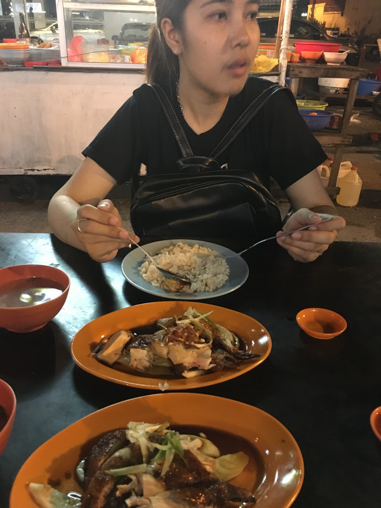 หลังจากถ่ายรูปเล่นแถวนั้นจนหนำใจแล้ว เราก็เดินทางกลับโดยรถเมย์ฟรีสายเดิม และเดินกลับมาที่โรงแรม อีกฟากนึงของโรงแรมจะมีตลาดของกินเล็กๆ คล้ายๆตลาดนัดย่อมๆอยู่ แต่ดูท่าจะเป็นคนจีนซะส่วนใหญ่ เราแวะไปกินข้าวเย็นที่นั่นค่ะ คุณลุงหน้าจีนๆคนนึงเดินมาแนะนำเมนู “Chicken Rice” โอเค Chicken Riceก็Chicken Rice มากินข้าวมันไก่ไกลมากเลยนะ-*- แต่ก็ไม่รู้เพราะหิวหรือเพราะมันรสชาติแปลก เพราะมันกลายเป็นข้าวมันไก่ที่อร่อยที่สุดเท่าที่เคยกินมาเลยค่ะ เราเป็นคนติดน้ำจิ้มมาก แต่พอกินข้าวมันไก่ของลุงแกเนี่ยะ น้ำจิ้มไม่ต้องมันอร่อยด้วยน้ำที่มากับไก่ในจานนั้นอยู่แล้ว รสยังติดอยู่ที่ลิ้น ถ้าได้กลับไปต้องไปกินอีกแน่นอน
