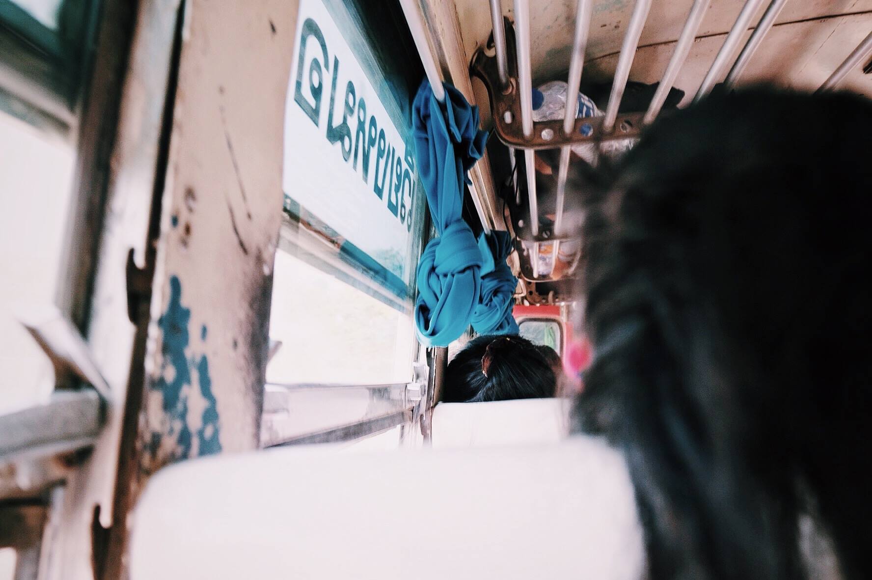 คืนรถเสร็จ ก็มาขึ้นรถที่ท่ารถเชียงราย รถได้อารมณ์มาก เป็นรถกระป๋องขึ้นสนิม ตอนนั่งสังเกตว่ารถเอียงไปข้างหนึ่ง ล้อมันส่งเสียงเหมือนอยากจะหลุดออกมายังไงไม่รู้ กระจกฝืดๆขัดๆ มีชาวบ้าน พระ นักเรียน บุคคลทุกเพศ ทุกวัย อยู่ในรถคันนี้ รวมทั้งนักท่องเที่ยวเด๋อๆอย่างเรา 4 คนด้วย เลยค่อนข้างเป็นจุดสังเกตไม่น้อย เราเดินทางไปตามถนนชนบท แต่ไม่ถึงขั้นขึ้นเขา เพียงแค่เปลี่ยนอำเภอเท่านั้น ถนนเลยยังไม่ชวนอ้วกมากนัก ตอนนี้เวลาเริ่มเย็นแล้วเราอยู่บนถนนในอำเภอพญาเม็งราย พระอาทิตย์เริ่มง่วงนอนแก้มแดงตุ่ย โชคดีที่รถคันนี้ไม่ปิดประตู ไม่มีประตู หรือประตูปิดไม่ได้ ก็จำความไม่ได้ รู้แต่ว่าเย็นวันนี้พวกเราได้ดูพระอาทิตย์ตกผ่านบานประตูรถกระป๋องขึ้นสนิมที่โยกไปโยกมาตามสภาพถนนชนบท ในบรรยากาศท้องนาที่มีข้าวสีเขียวตองอ่อนสลับเหลืองทอง มีพระอาทิตย์ทรงไข่แดงเข็มไชยาลอยอยู่ข้างบน สักพักก็ลับขอบฟ้าไป