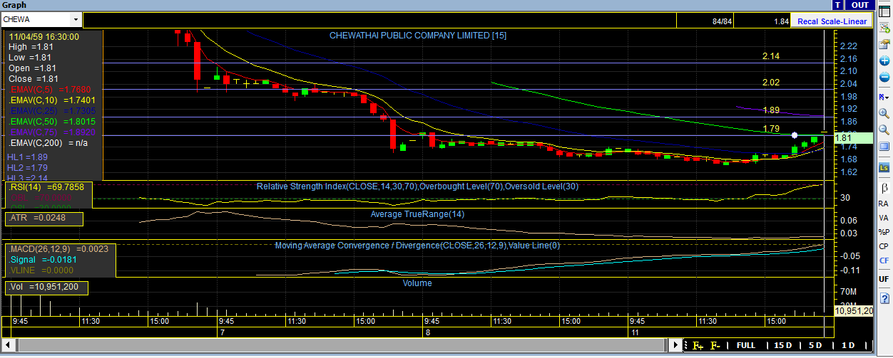 CHEWA [15min TF] ipo ใหม่ที่ได้ทำการระเบิดราคาขึ้นมาให้เห็นกันแล้วหลังจากที่ลงดึ่งมาหลายวัน ราคามาปิดเหนือ EMA 50 วันได้ถือว่าใช่ได้ พร้อมๆกับการเรียงตัวของ EMA 5, 10, 25 และ MACD ที่ตัดขึ้นเหนือ 0 อีกด้วย แต่คราวนี้ CHEWA จะเลียนแบบ GTB หรือเปล่าที่ลากขึ้นมาเพื่อทุบ น่าสนใจมากเลยที่เดี่ยว แต่มีแนวต้านอยุ่พอสมควร
