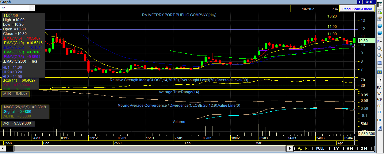 RP จ่อลุ้นที่จะทะลุต้านใหญ่ที่ 11 บาท EMA 50 กับ 75 กำลังทำการเรียงตัวถือว่าเป็นสัญญานที่ดี มีโอกาศไปต่อได้ หวังให้โวลุ่มเข้ามากกว่านี้ด้วย น่าติดตามครับว่า RP จะกลับมาสร้างความฮือฮาได้อีกหรือไม่