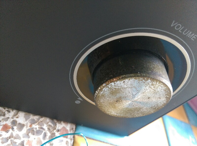 กระติกน้ำร้อนนี้เป็นยี่ห้อ SHARP อายุการใช้งานเกิน 30 ปีแล้ว สภาพภายนอกจากสีขาวก็กลายเป็นสีครีม ลวดลายดอกไม้ยังมีให้เห็นจางๆ มีสนิมขึ้นบางๆ หลายจุด ปั๊มดูดน้ำที่ฝาใช้ไม่ได้มา 5 ปีแล้วตอนนี้ต้มน้ำเสร็จ