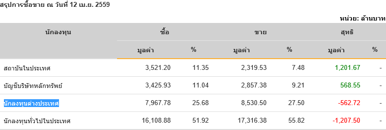 Sinthorn Summary 12/04/2559 : ต่างชาติขายสุทธิ -562.72 ลบ.