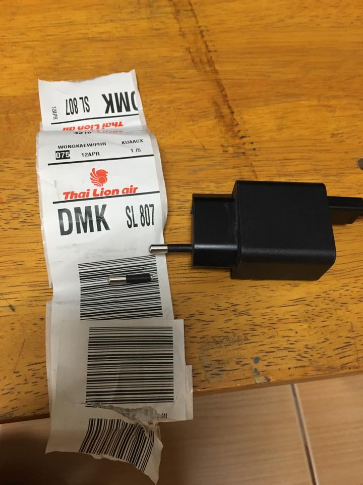 กลับจากกระบี่วันนี้ มาดูที่ชาร์จโทรศัพท์(ซื้อมาใหม่)ในกระเป๋าที่โหลดใต้ท้องเครื่อง ผลปรากฎตามภาพ มันโยนแรงขนาดนั้นเลยหรือ **จริงๆ มันยังไม่หัก แต่มันงอไปอยู่ด้านเดียวกัน เลยดัดให้มาอยู่ที่เดิม สุดท้ายหัก** หรือว่าที่ชาร์จไม่ทน