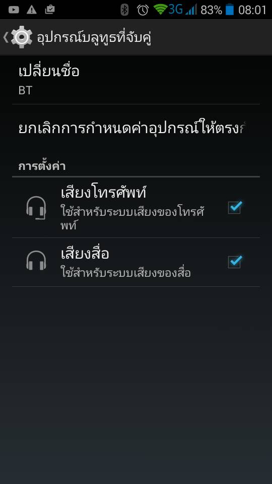 http://www.itruemart.com/products/sport-sonun-bt-6-2143333234232.html) ซึ่งระบุชัดเจนว่าสามารถสนทนาโทรศัพท์ได้ แต่เมื่อผมนำมาใช้คู่สนทนากลับไม่ได้ยินเสียงผมแม้แต่นิดเดียว เหมือนผมปิดไมค์อยู่แต่ผมได้ยินเสียงของคู่สนทนา เปิดเพลงฟังก็ได้ยินเสียงปกติ ถ้าวางสายไปแล้ว ทดสอบไมค์กับแอพอื่นๆ เช่นค้นหาใน Google ด้วยเสียง ก็สามารถใช้ได้ไม่มีปัญหา มีปัญหาก็แค่ตอนใช้สายเท่านั้น ผมเลยลองตั้งค่าต่างๆดู ตามรูปด้านล่างนี้ ถ้าผมเอาติ๊กถูก ในช่อง "เสียงของโทรศัพท์" ออก ผมจะสามารถใช้ไมค์ในการสนทนาได้ แต่ผมจะไม่สามารถได้ยินเสียงของคู่สนทนาผ่านตัวหูฟังได้ ผมก็สรุปเอาเองง่ายๆว่า ตัวหูฟังมีปัญหา ไม่ใช่ผม หรือ โทรศัพท์แล้วละ