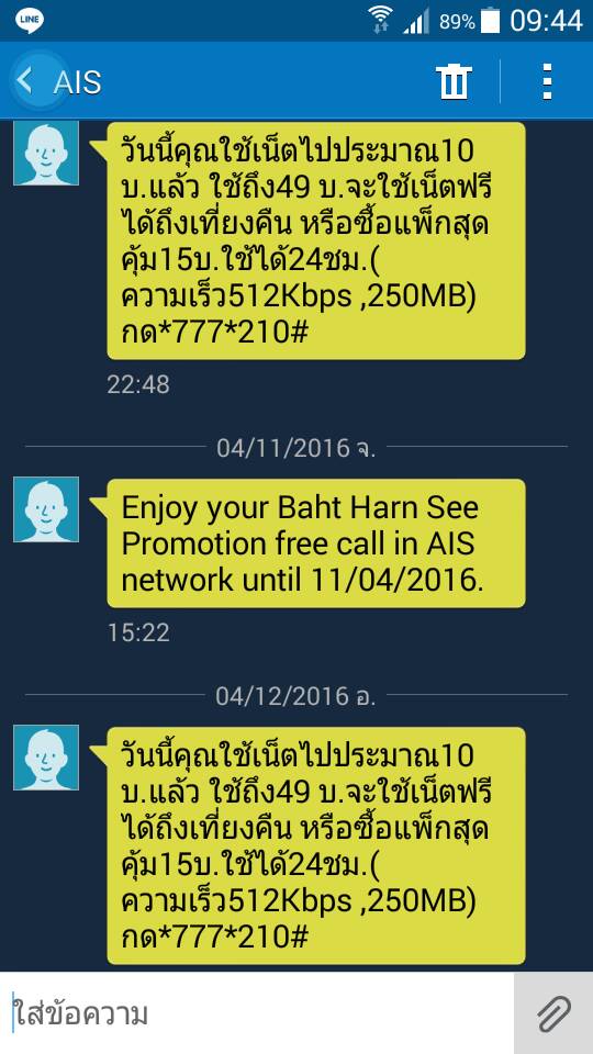เน็ตหมดตอนประมาณ 1 ทุ่มกว่าๆ เราเลยปิดเน็ตไว้แล้วเล่น wifi จน 3 ทุ่ม AIS ส่งข้อความมาว่า "วันนี้คุณใช้เน็ตไปประมาณ 10 บาทแล้ว ใช้ถึง 49 บาทจะใช้เน็ตฟรีได้ถึงเที่ยงคืน หรือซื้อแพ็กสุดคุ้ม15บ.ใช้ไ