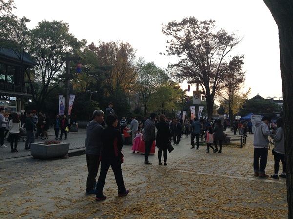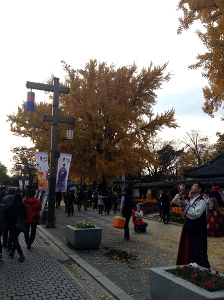 แต่วันนี้คนเยอะ เพราะเป็นวันหยุด อากาศดีมากกก สุดๆๆ อากาศมันสะอาด สดชื่นบอกไม่ถูก เย็นสบาย ดอกไม้ก็สวย แล้วด้วยความที่นี้ เป็นเมืองเก่า คนสามารถเช่าชุด ฮันบก ใส่เดินรอบเมือง ถ่ายรูปเล่นได้นะ ถือเป็นเรื่องธรรมดามาก ถ้าใครใส่เดิน ตอนแรก เรากะว่าจะใส่แล้วล่ะ แต่เกรงใจเพื่อน กลัวเพื่อนรอ 555 โอ้ยย เหมือนอยู่ในซีรีย์เลยย ละลานตามากอ่ะ โอ้ยย อยากหยุดเวลาสุดๆ