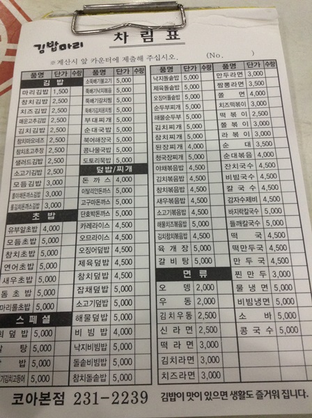 เราพออ่านภาษาเกาหลีได้อยู่บ้าง ถ้าเป็นเมนูอาหารนี้แปลออกได้สบายเลยแต่ถ้าเป็นศัพท์ยากๆนี้คงต้องหา กูเกิ้ล ช่วย เลยทำให้เรารู้ว่า คิมบับนี้ มันมีหลายใส้มากก เลือกได้ตามใจ ร้านนี้เป็นร้านที่ทำ คิมบับแบบสดๆเลยนะ อาจุมม่า โปรมาก ไม่ต้องมีแผ่นไม้ม้วนข้าวปั้น อาจุมม่าสามารถห่อได้ด้วยมือ
