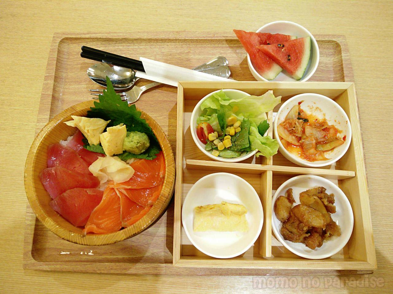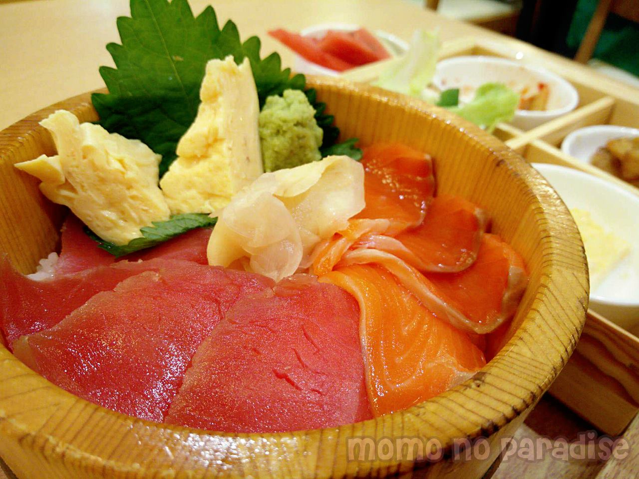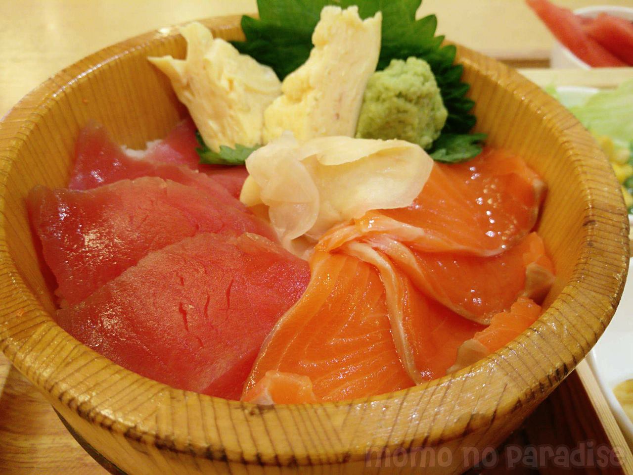 ซูมที่จานหลักกัน!!!! นอกจากทูน่า+แซลมอนสไลด์แผ่เต็มจานแล้ว ยังมีไข่หวานตกแต่งให้ด้วยอีก 2 ชิ้น ขนาดไม่ใหญ่มาก แต่ก็ไม่เล็กจนเกินไป . . . แต่น่าเสียดาย สำหรับเราเนื้อปลามันบางไปหน่อย แม้จะกินคู่กับข้าวหมดพอดี แต่ก็รู้สึกอยากให้ชิ้นหนาก็นี้ซักนิสสส