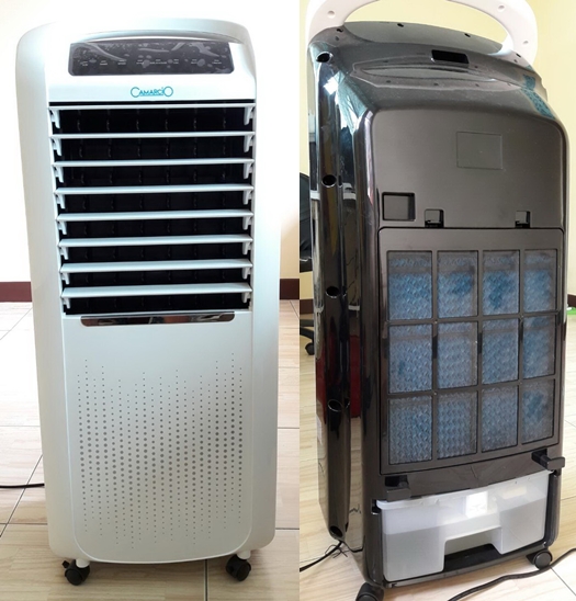 ในส่วนของแผงข้างหลังที่ใส่น้ำแข็งแรงกว่ายี่ห้อ H ตัวเล็ก (ดูวันนั้นมันไม่มีตัวใหญ่) ใส่น้ำได้ 7 ลิตร แถมเจลเย็นให้ 2 อัน ถ้าน้ำหมดตัดปั๊มอัตโนมัติ เปิดไอเย็นได้ประมาณ 4-5 ชั่วโมง ถ้าเปิดเบอร์แรงหรืออากาศร้อนก็หมดเร็วกว่า ขนาดรังผึ้งหนาประมาณ 1 นิ้ว ทำความสะอาดง่าย
