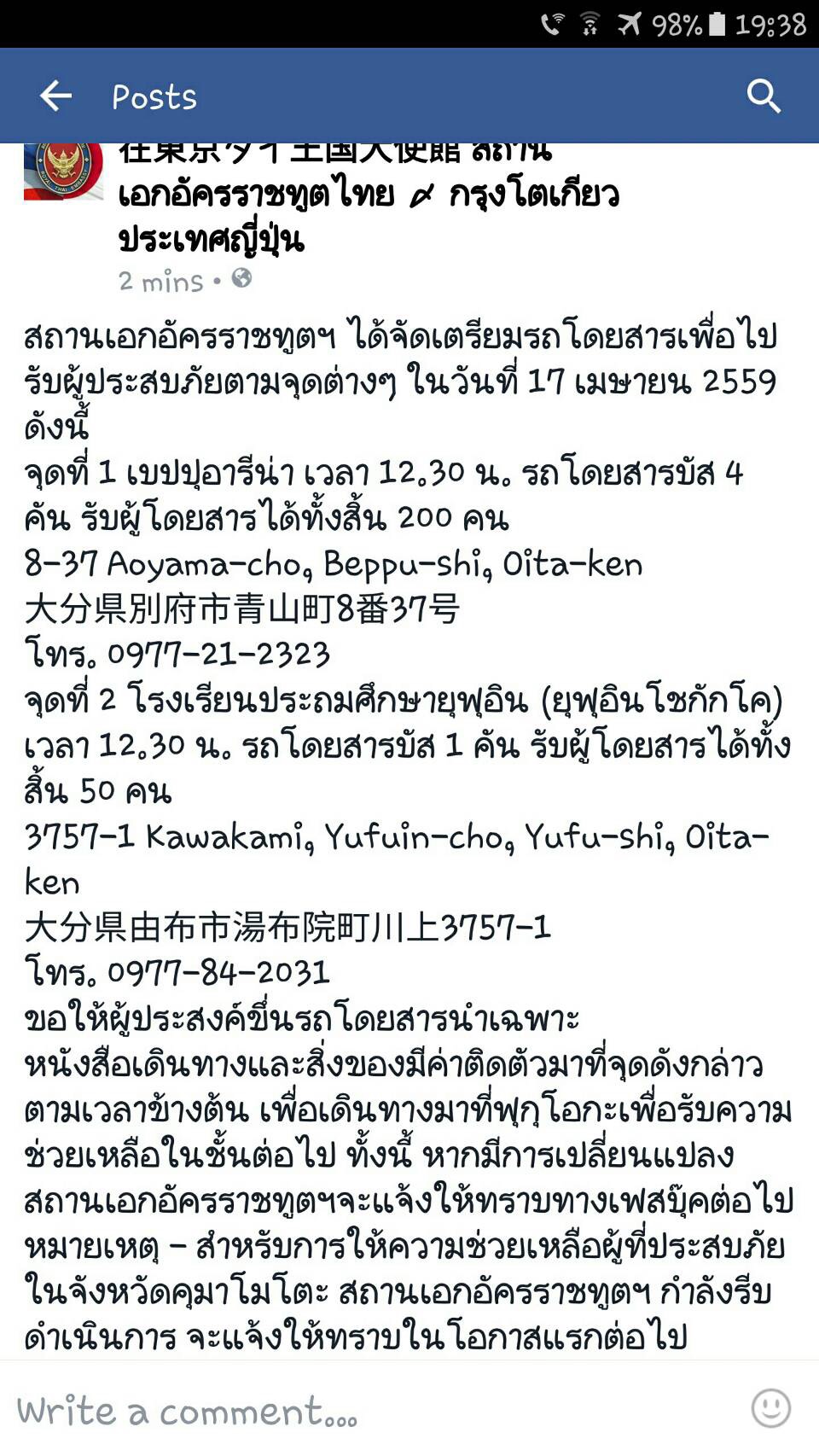 พรุ่งนี้สถานฑูตไทยจะส่งรถทัวร์มารับที่ Yufuin elementary school