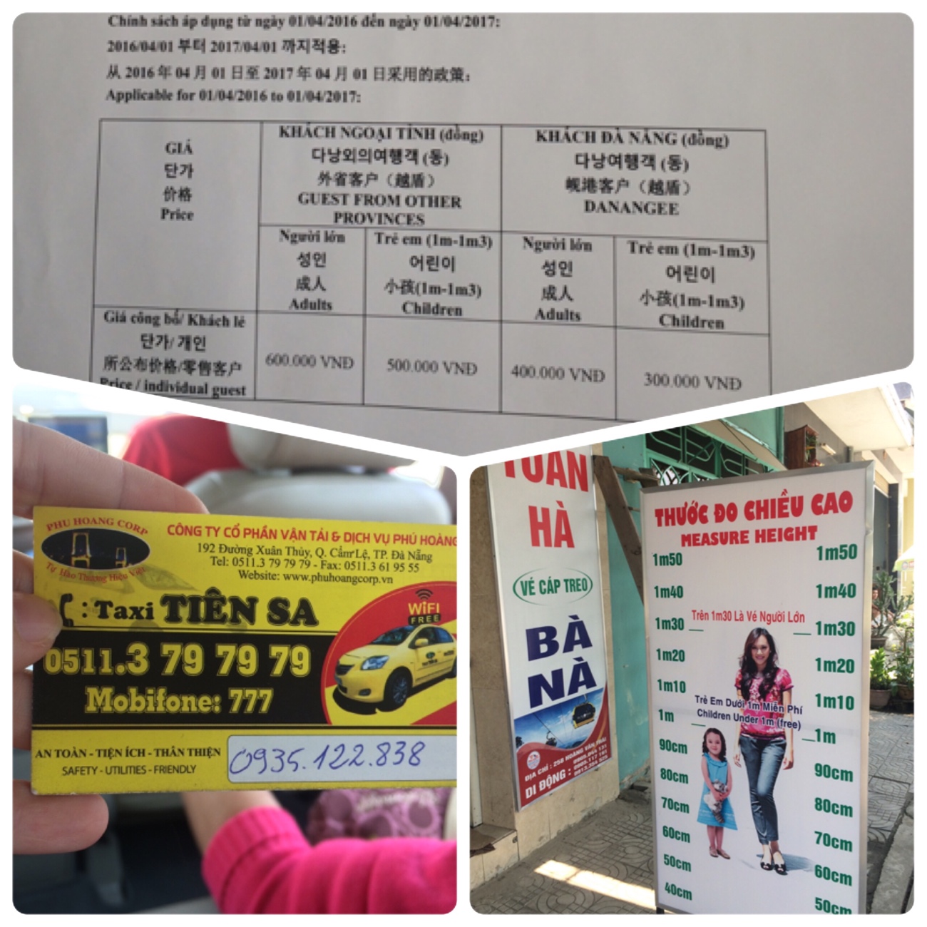 เริ่มต้นออกเดินทาง ได้แท็กซี่หน้าโรงแรมชื่อ Tien sa สีเหลือง คิดราคาเหมา 380,000 VND แท็กซี่ที่นี่แบรนด์ดังๆจะมีฟรีไวไฟล์ด้วยนะ พอเข้าใกล้จุดหมาย แท็กซี่จะจอดให้ซื้อตั๋วกับร้านข้างทาง แอบหวั่นว่าจะโดนหลอก แต่ดูป้ายแล้วราคาเท่ากันกับที่บานาฮิลล์ สังเกตว่าแท็กซี่เหลืองนี่พามาซื้อข้างทางกันทุกคัน คงได้หัวคิวกันละ