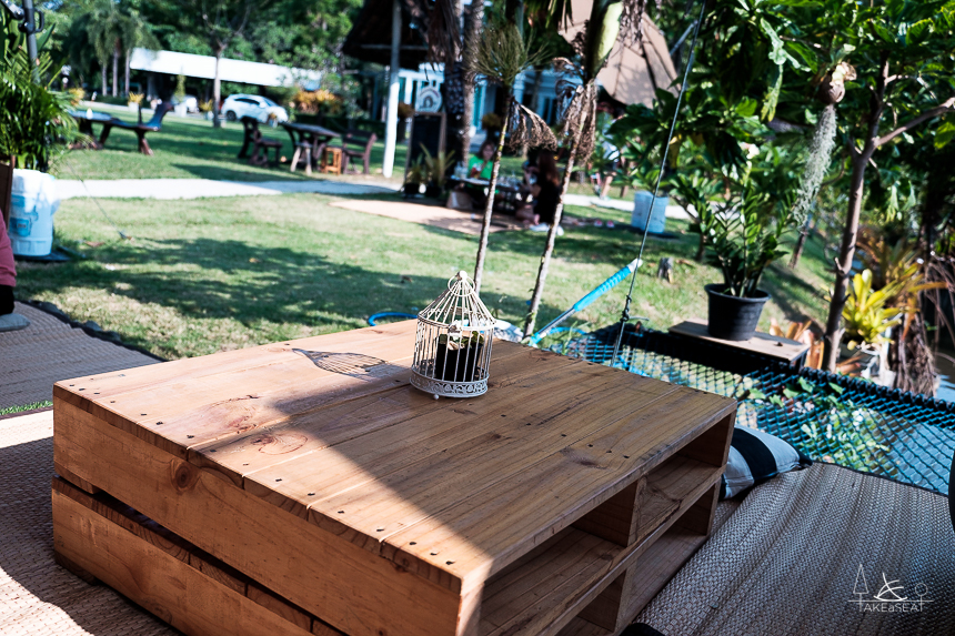 มาดูเรื่องที่นั่งกันบ้างง โต๊ะมีสามแบบนะครับ มีโต๊ะ นั่งอันนี้อยู่โซนกลางสนามหญ้าครับ
