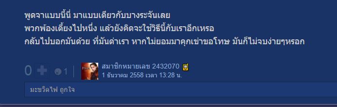 ไอ้ที่มันเป็นคดีความมาได้ถึงวันนี้ ก็เพราะคนโปรดของคุณน่ะแหละ เอาเรื่องส่วนตัวในชีวิตจริงมาเล่น ถ้ามันเป็นแค่เรื่องด่ากันไปมาระหว่างสีเสื้อ ขอบอกว่ามันจิ๊บๆมาก ผมคงไม่ต้องมาพูดเอาหล่อว่า ชั้นเล่นมาตั้ง 18-19 ปี ไม่เคยถือโทษโกรธเคืองใคร ผมว่าทุกคนในนี้แหละ ไม่มีใครบ้าเอาเรื่องถกเถียงด่าทอขัดแย้งกันในบอร์ดไปแจ้งตำรวจให้เสียเวลาหรอก ผมเล่นห้องนี้มาสิบกว่าปี โดนสลิ่มด่ามาหนักกว่านี้ ยังไม่เคยคิดจะไปแจ้งความเอาผิดใคร เถียงกันในบอร์ดการเมือง เราไม่ด่าเขา เขาก็ด่าเรา มันก็เท่านั้น เหมือนสาดน้ำรดกัน มันย่อมเปียกปอนด้วยกันทั้งคู่