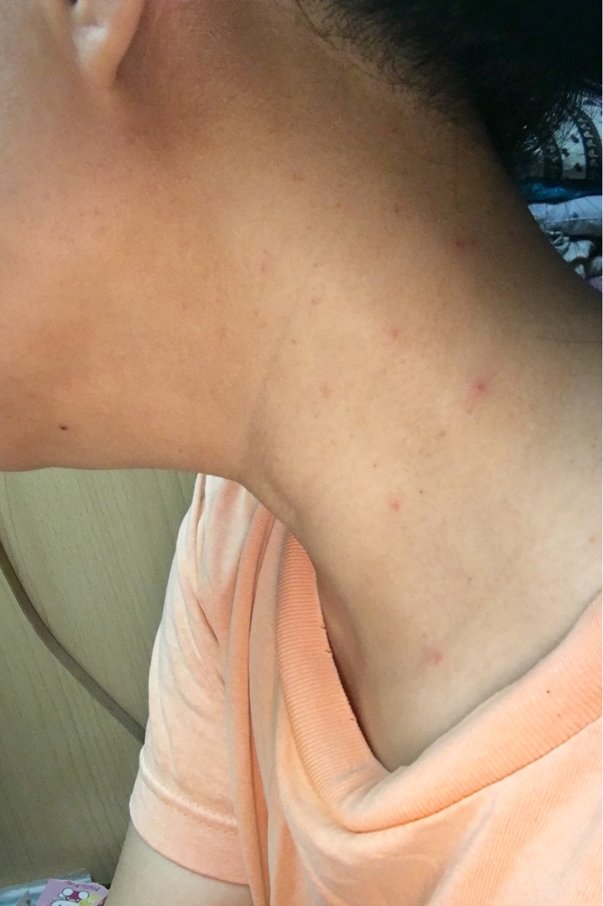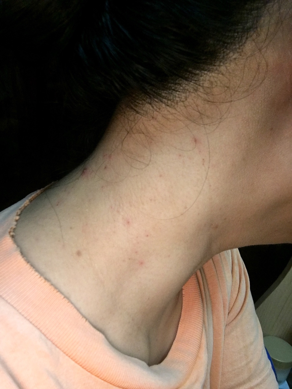 เวลาอากาศร้อน เราจะมีเม็ดเล็กๆ คล้ายผดขึ้นตามลำคอ และเหนือหน้าอก มีอาการคัน และพอเหงื่อออก จะมีอาการแสบมากๆ อาการแสบและคันจะหายเมื่ออยู่ในห้องแอร์ แต่เจ้าผื่นจะไม่ยุบทันที คงค้างทิ้งไว้ให้ดูต่างหน้าไปเรื่อยๆ