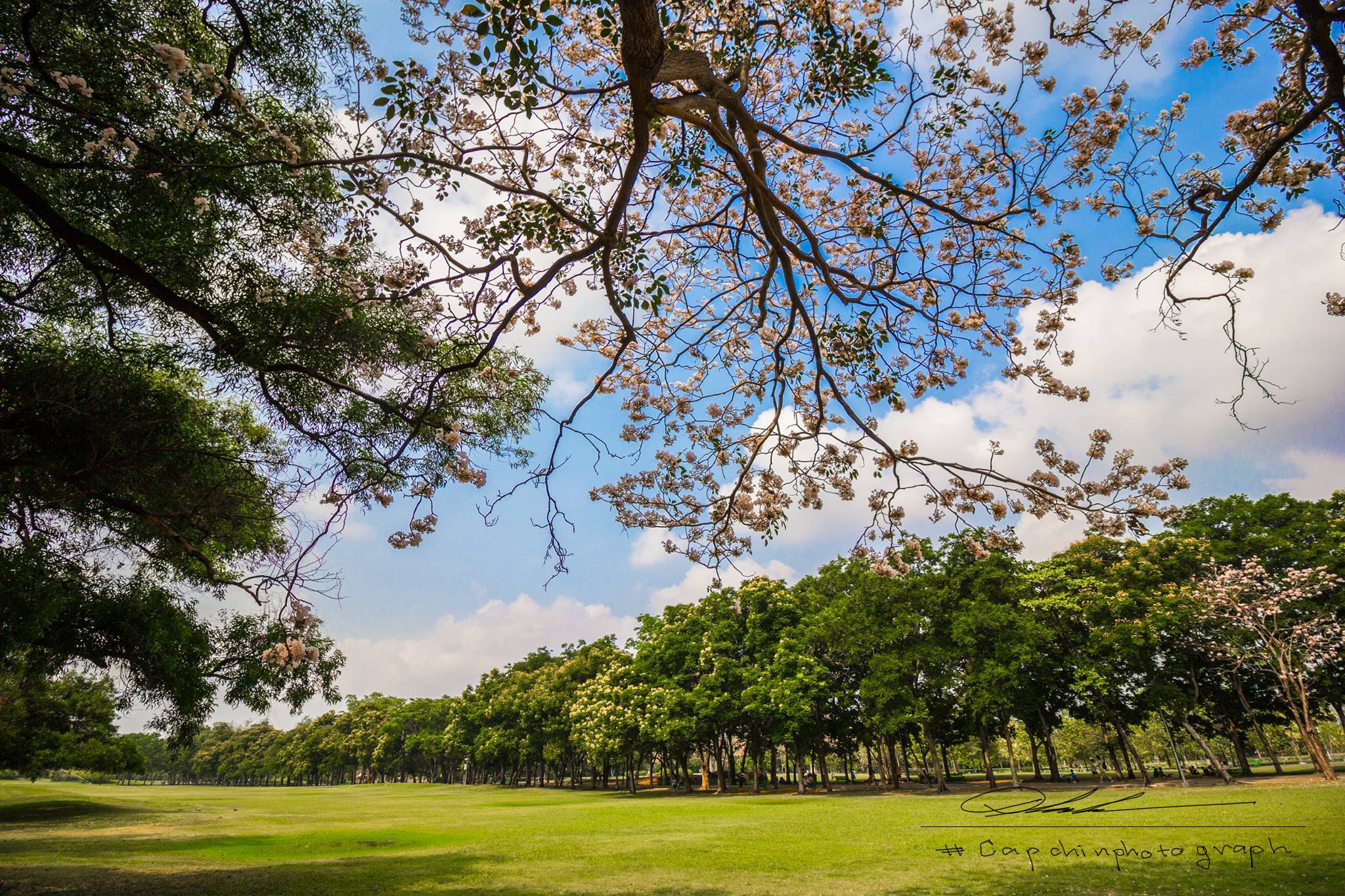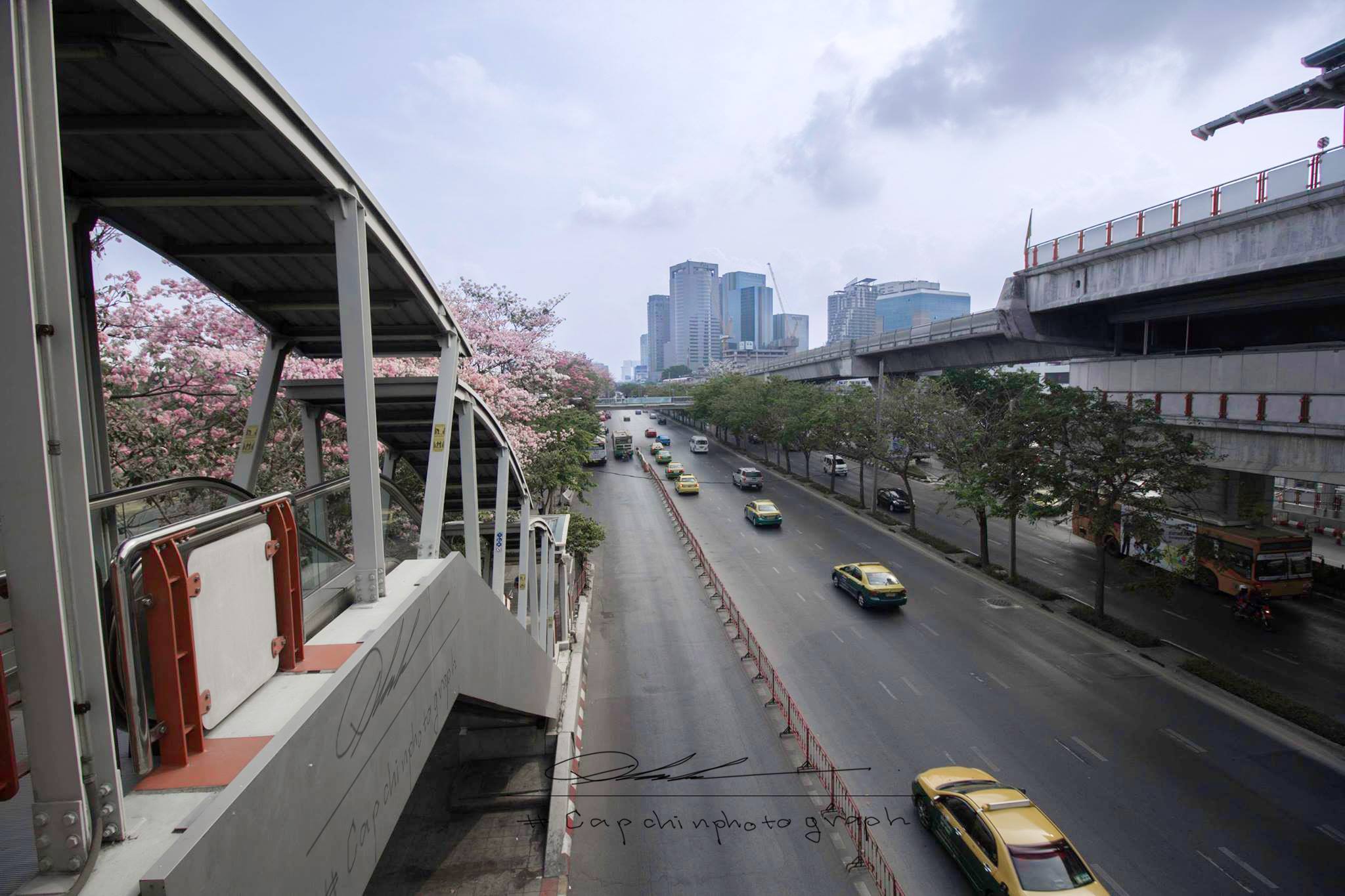 ซึ่งมีดอกชมพูพันทิพย์บานสะพรั่งอยู่บริเวณริมรั้วของสวนจตุจักรเป็นแนวยาว