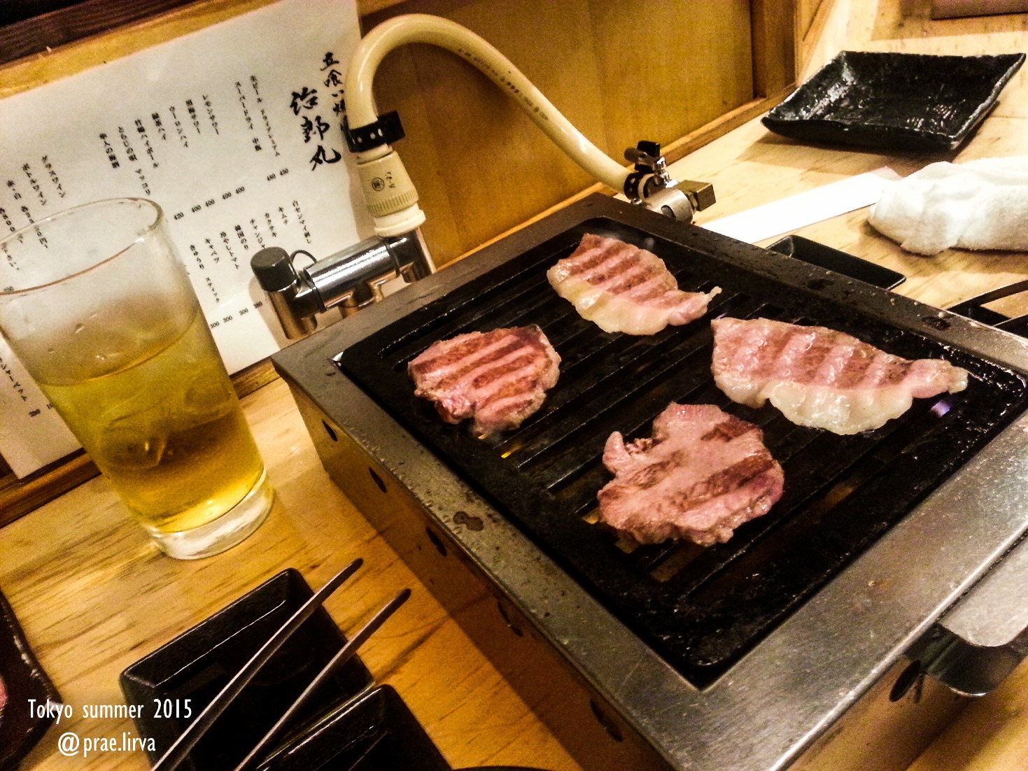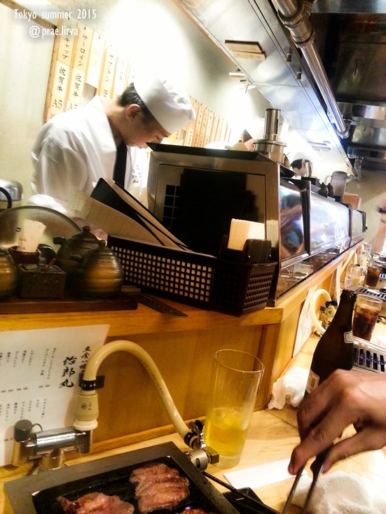 รอไม่ถึงสิบนาทีก็ได้เข้าไป บรรยากาศร้านแคบมากเป็นที่เชฟยืนหั่นเนื้อ เคาเตอร์วางเนื้อและที่วางเตาของเรา
