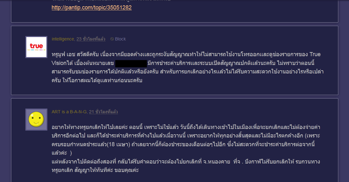 บอกเลยว่าคงไม่ดั้นด้นข้ามจังหวัดไปยกเลิกค่ะ คุณพ่อสุขภาพไม่อำนวยจริงๆ อยากฟ้อง ฟ้อง ไม่จ่ายแล้ว นี่อะไรต้องเสียอีกเต็มรอบบิล เสียความรู้สึกอุตส่าห์ไปชำระยอดทั้งที่ไม่ได้ใช้ เพราะโดนตัดสัญญาณ อันนี้ก็ยอมรับ เพราะยังไม่ไปขอยกเลิก ยอมจ่ายในส่วนนี้