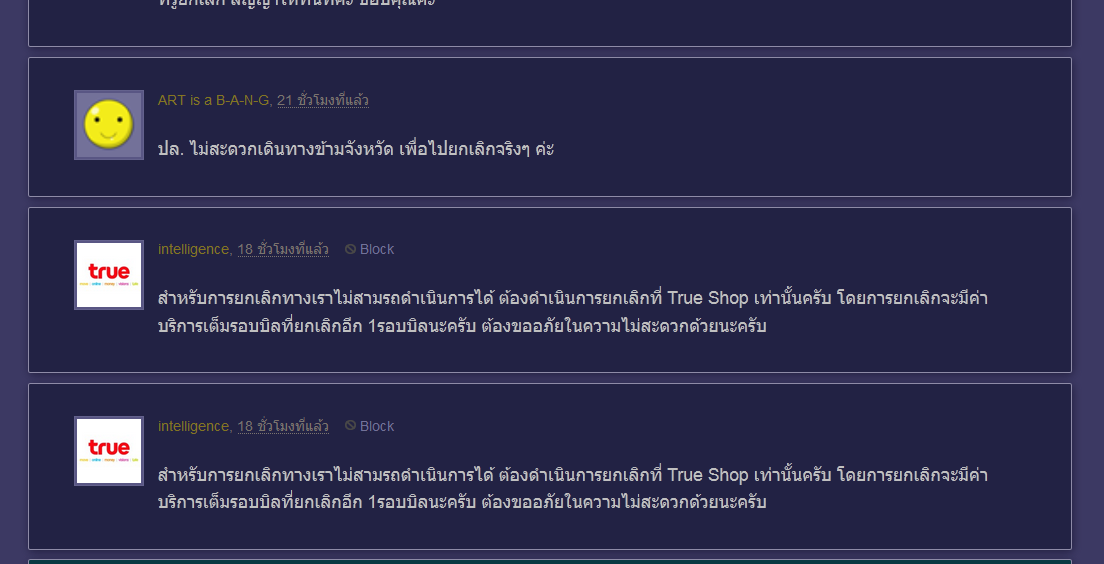 เสียความรู้สึกมาก ที่ทรูช่วยเหลือลูกค้าได้เท่านี้ ไม่มีอะไรที่จัดการได้ดีกว่าแล้วเหรอคะทรู ตอนติดตั้งทำไมง่ายจัง มาทำให้ถึงที่ไม่เห็นต้องไปติดต่อช็อปให้ยุ่งยาก พอยกเลิกลำบากลำบนจัง นี่ยังไม่รวมถึงกิริยาที่พนักงานทำ ระหว่างคิดว่าไปขอเปิดเบอร์ กับปิดเบอร์นะคะ แม่เจ้าหน้ามือเป็นหลังทีน