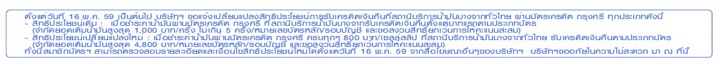 เพิ่งดูใบแจ้งหนี้บัตรเครดิต ปกติ บัตรกรุงศรที่ถืออยู่คือ Doctor card เวลาเติมน้ำมันบางจากครบ 800 บาท จะได้รับเงินคืน 2% หรือ 16 บาท แต่มาเดือนนี้ ลดเงินคืนเหลือเพียง 1% หรือ 8 บาทเท่านั้น จึงอยากทรา