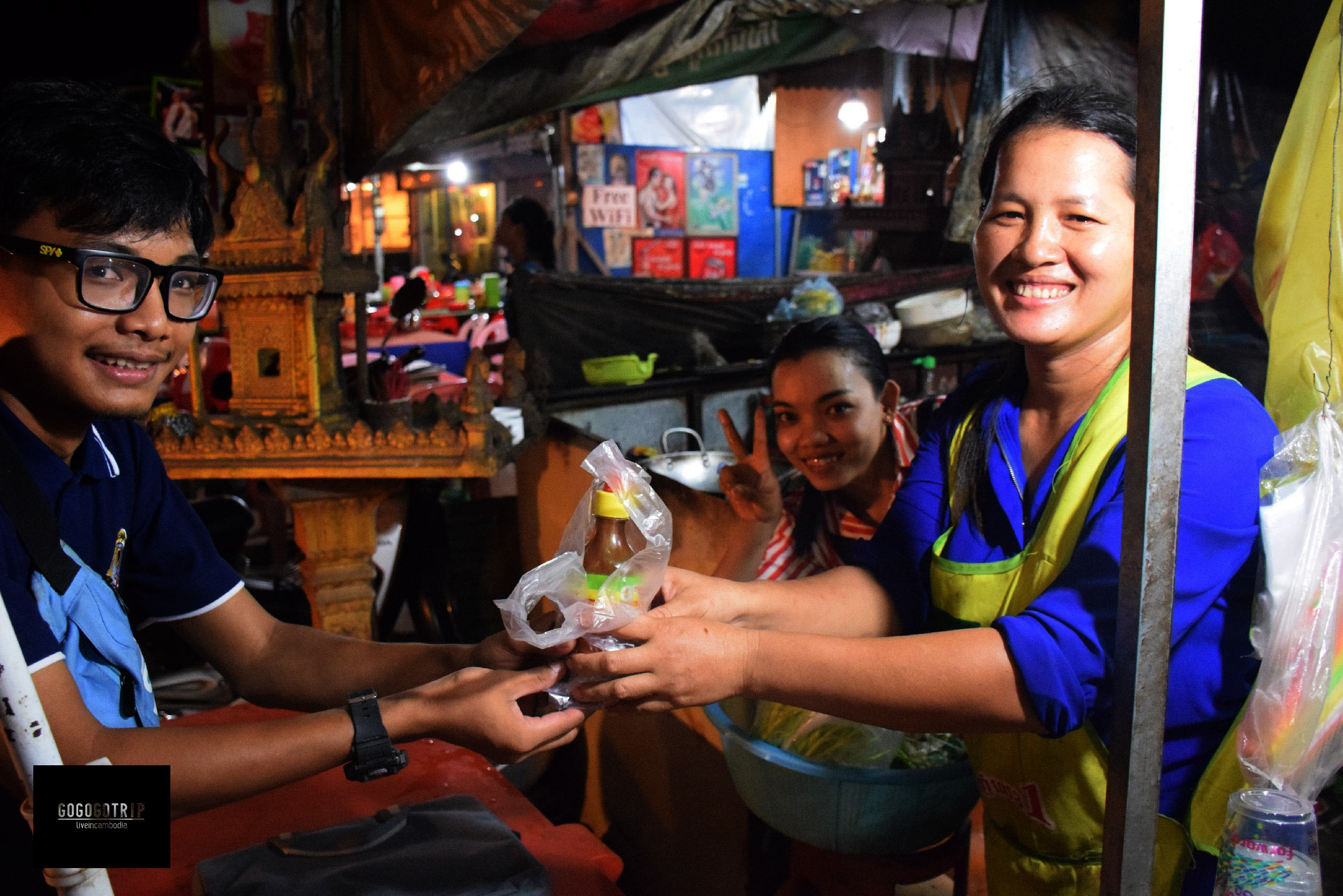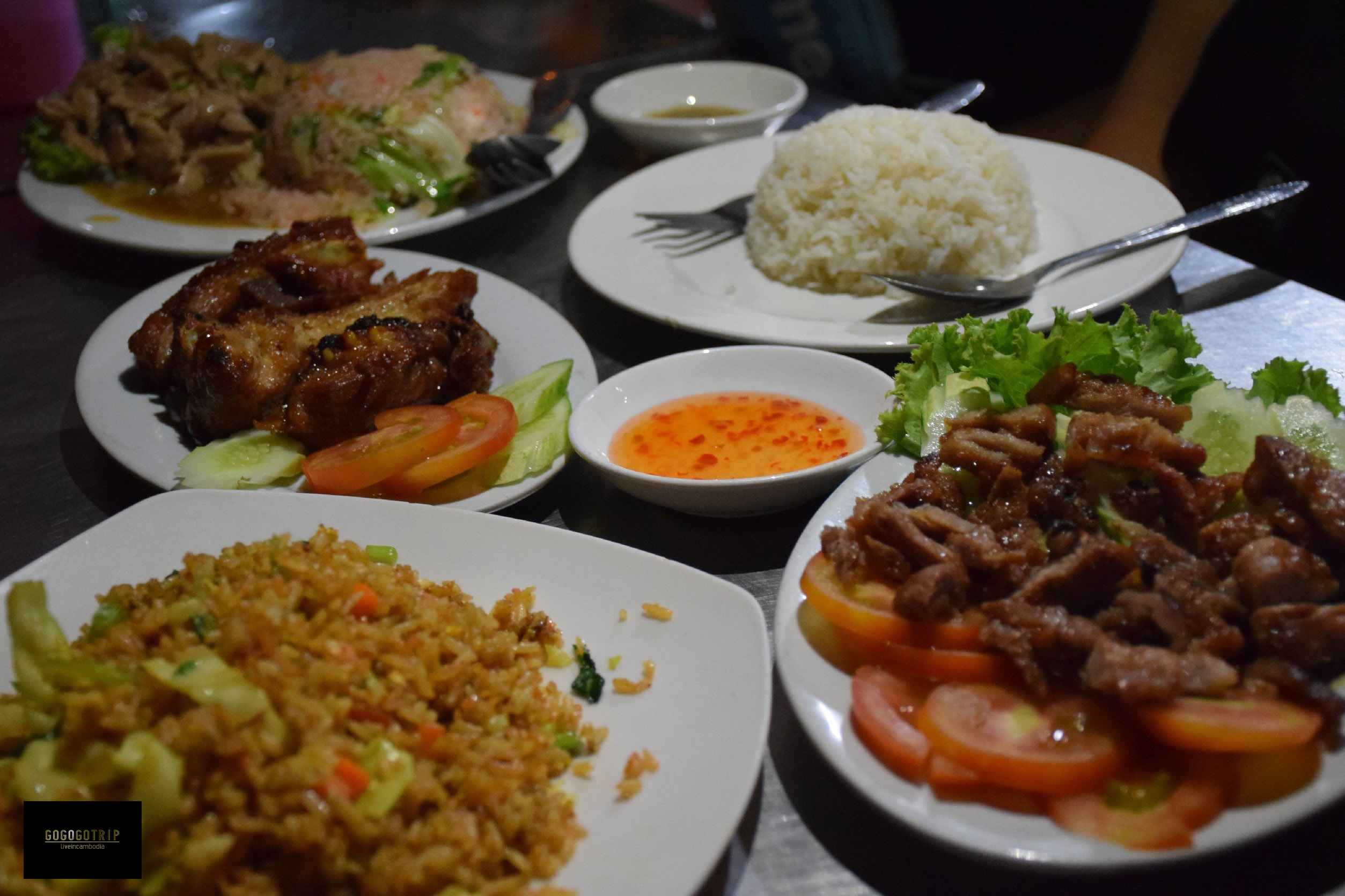 มื้อแรกของเราก็หามองหาร้านที่มีคนกินเยอะๆ น่าจะอร่อยตามไทยสไตล์ เราก็เลือกไปร้านนึง อาหารที่กัมพูชาก็คล้ายๆที่อาหารไทย แต่จะจืดกว่ามาก ราคา 1.5-3$ ซึ่งแพงอยู่พอตัวเลยสำหรับคนงบน้อยอย่างพวกเรา ระหว่างที่รออาหารมาด้วยความอยากรู้อยากเห็นของเราเหลือบไปเห็นถาดเครื่องปรุง มีซอสหน้าตาแปลกอยู่หลายตัว สนุกสิครับ ลองชิมกันไป จนไปสะดุดกับซอสหนึ่งตัว “พี่เขาชื่อฮอยซิน” รสชาติถูกปากคนไทย (แต่น่าจะมาจากเวียดนาม) ใครไปก็ลองไปหาชิมกันดูนะครับอร่อยใช้ได้ แถมหลังจากกินเสร็จแม่ค้าใจดีเห็นพวกเราปราบปลื้มมันเหลือเกิน เลยยกให้เราไปกินต่อที่เมืองไทยเลยครับ ขอบคุณมากๆนะครับ