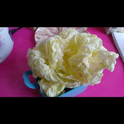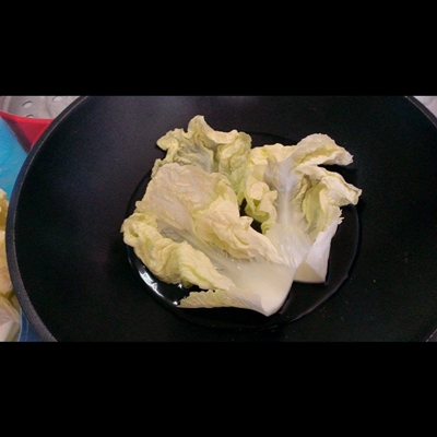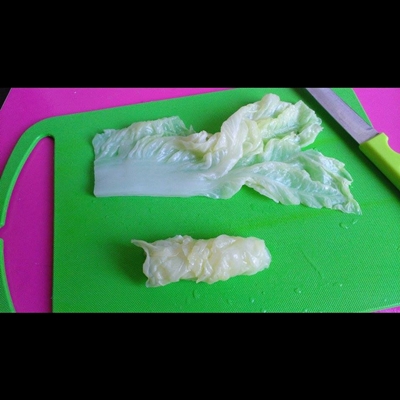 1.ล้างผักกาดหันส่วนที่ไม่ใช้ออก และแยกออกมาทีละใบ จากนั้นต้มน้ำให้เดือดเพื่อทำการลวกผักกาด (ลวกแค่พอใบหายกรอบ)