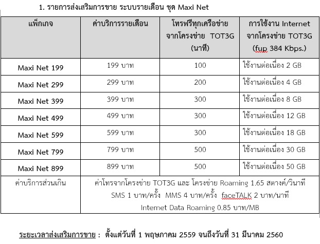 โปรใหม่ TOT3G ระบบรายเดือน เริ่ม 1 พ.ค.59