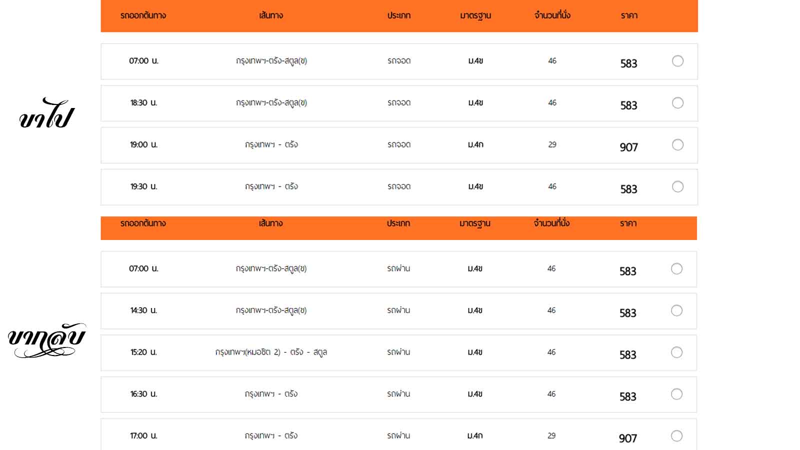ซึ่งจะมีหลายเวลาให้เลือก จากสถานีต้นทาง สถานีขนส่งผู้โดยสารกรงเทพ(ถนนบรมราชชนนี) ปลายทาง สถานีขนส่งผู้โดยสารตรัง ทุกคันเป็นรถแอร์สองชั้น และจะจอดพักกลางทางเพื่อให้เราลงไปรับประทานอาหาร ซึ่งก็ถือว่าเป็นอะไรที่คุ้นเคยสำหรับคนเคยนั่งอยู่แล้ววว เราออกเดินทางตั้งแต่เวลา 18.30 น. และแล้วก็ถึงปลายทางของเรา ตรังงง!!! ในเช้าวันอาทิตย์ เวลา 7 โมงกว่าๆ ซึ่งเราก็ใช้เวลาส่วนใหญ่ไปกับการเตรียมแผนต่างๆว่าเวลาที่เรามีเนี๊ยย วันเสาร์ทั้งวันถึงวันอาทิตย์ 11 โมงจะทำอะไรให้คุ้มค่าที่สุด แล้วเหมือนสวรรค์ก็เป็นใจบนรถที่เรานั่งมามีพี่สาวใจดี ซึ่งพี่เค้าเป็นคนในพื้นที่ บ้านอยู่ไม่ไกลเมืองและกำลังกลับบ้าน ซึ่งพี่เค้าก็ให้คำปรึกษาและช่วยเราวางแผนเที่ยวอย่างดี
